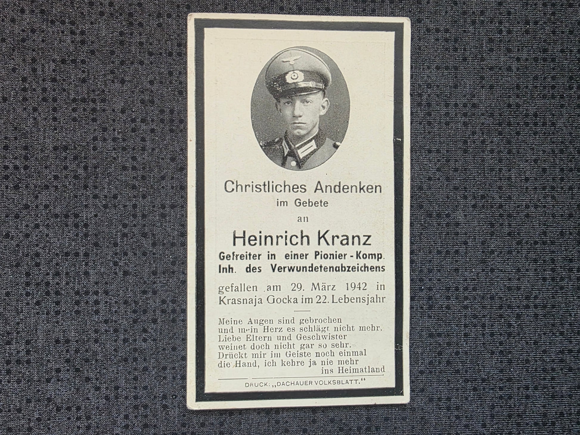 Sterbebild Gefreiter Prittelbach 2. Komp. Pio. Btl. 268 Krasnaja Gorka Russland