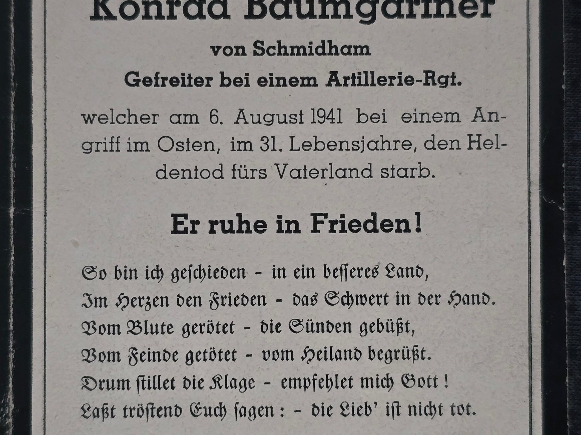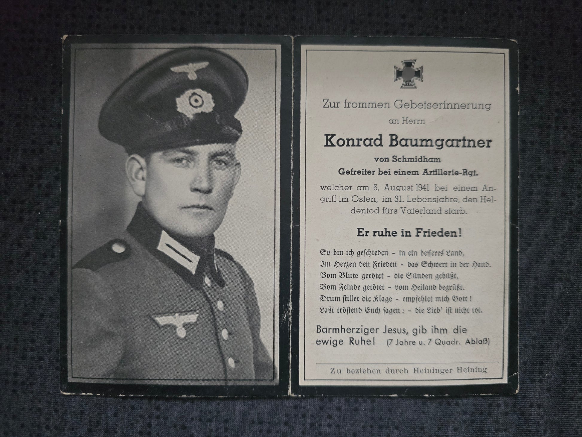 Sterbebild Gefreiter Schmidham 8. Batterie Art. Regt. 260 Kobylschtschina Weissrussland