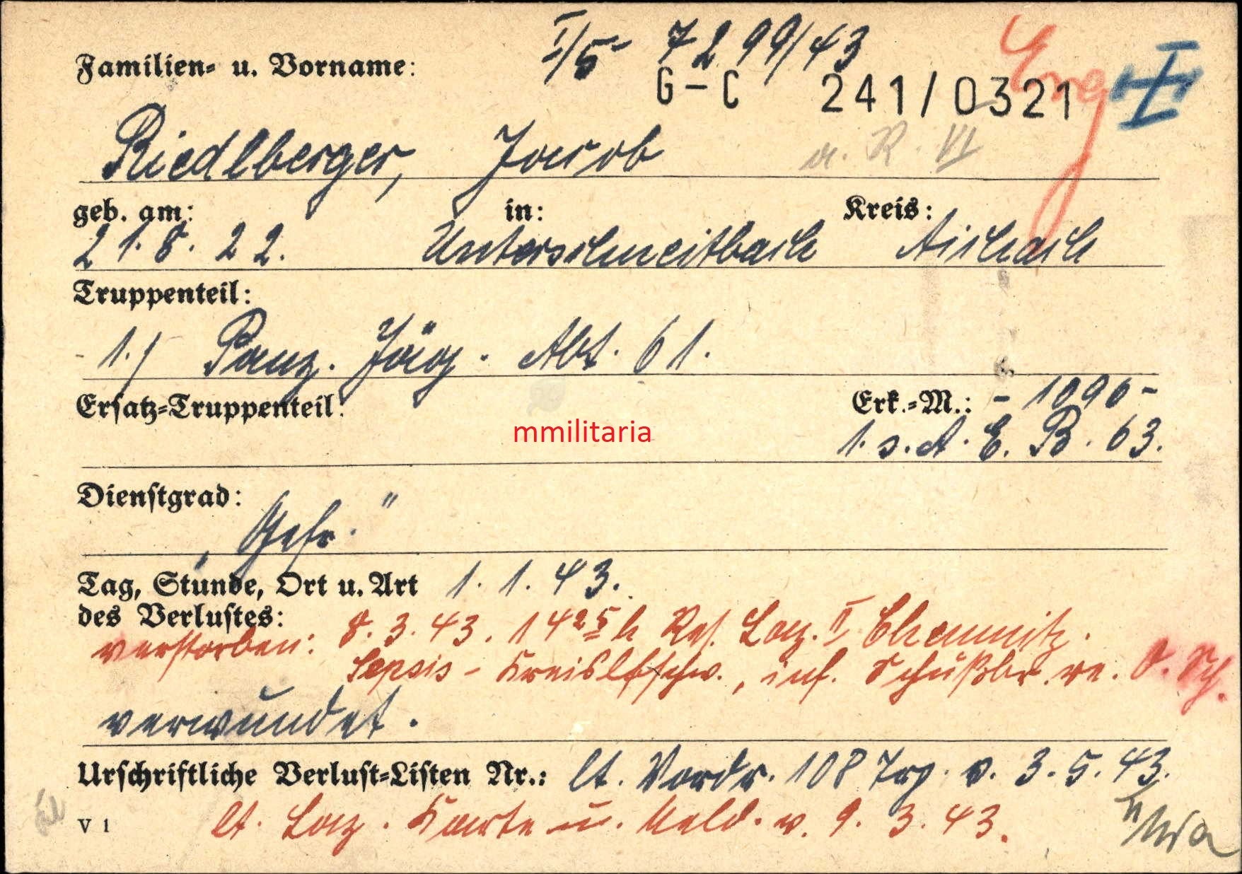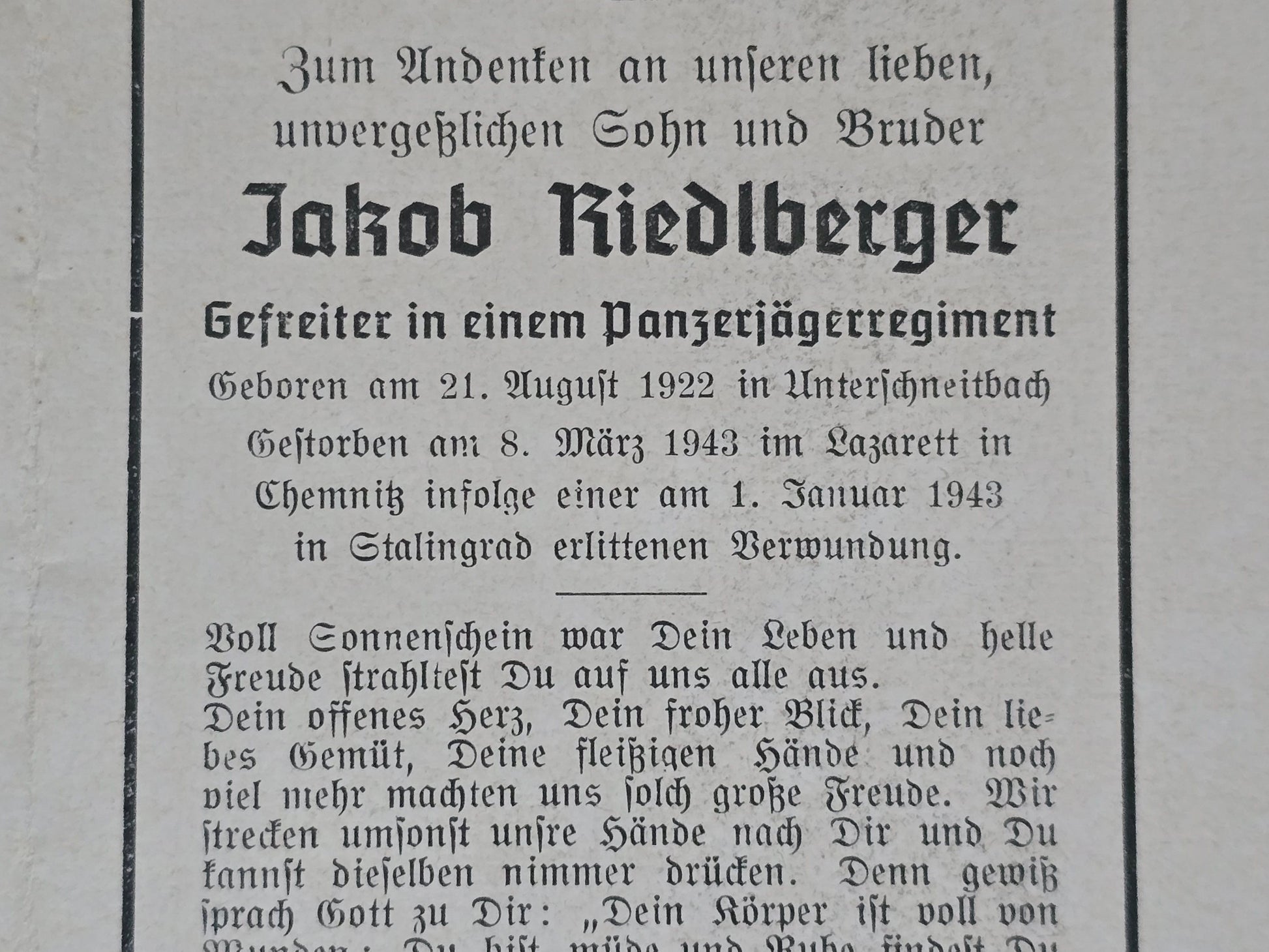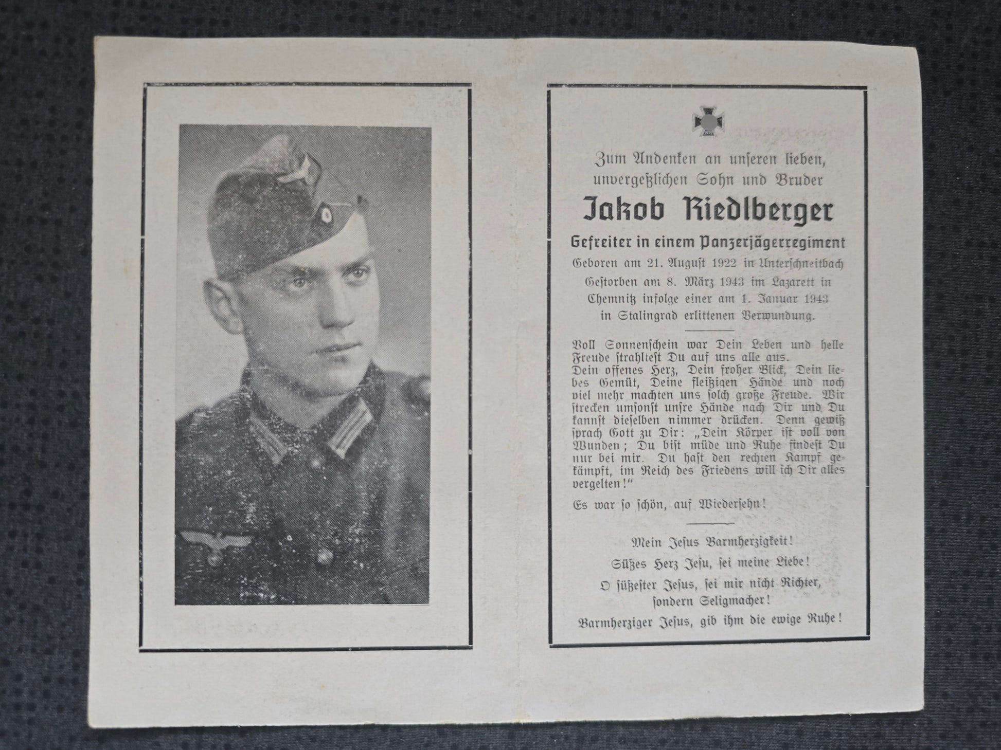 Sterbebild Gefreiter Unterschneitbach 1. Panzer-Jäger Abt. 61 Stalingrad Chemnitz II Deutschland
