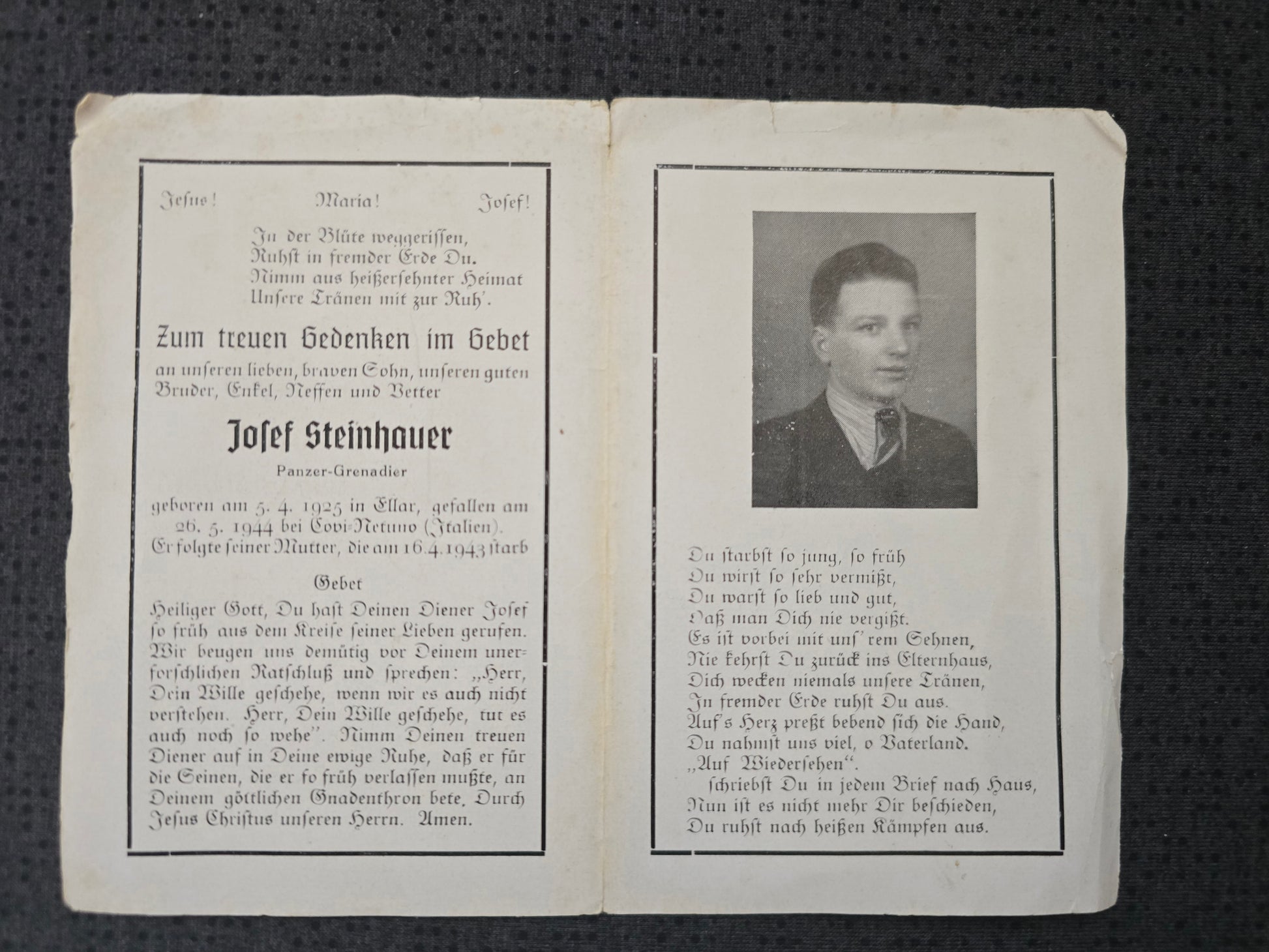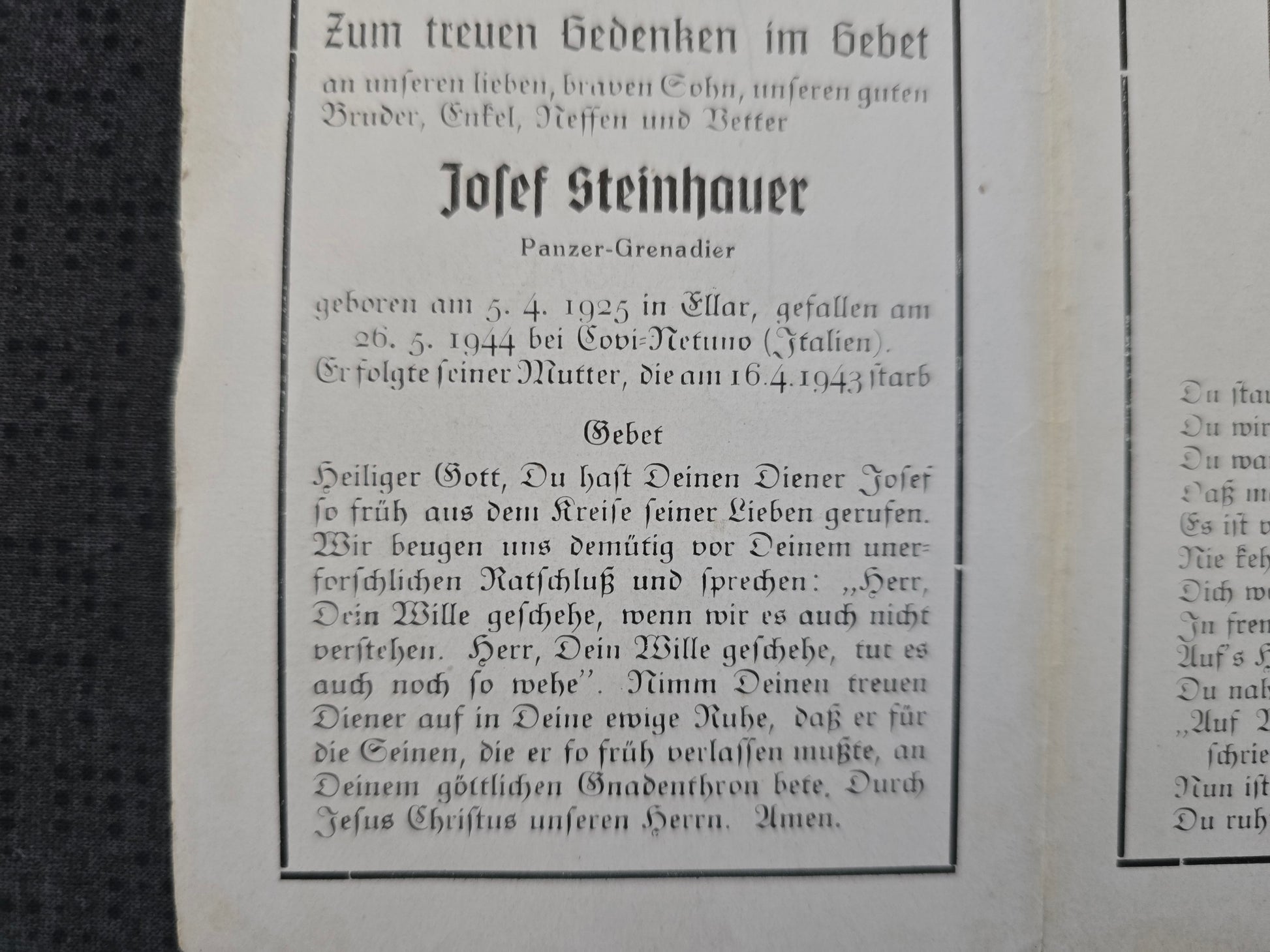 Sterbebild Grenadier Ellar Panzer Abt. Covi-Nettuno Pomezia Italien