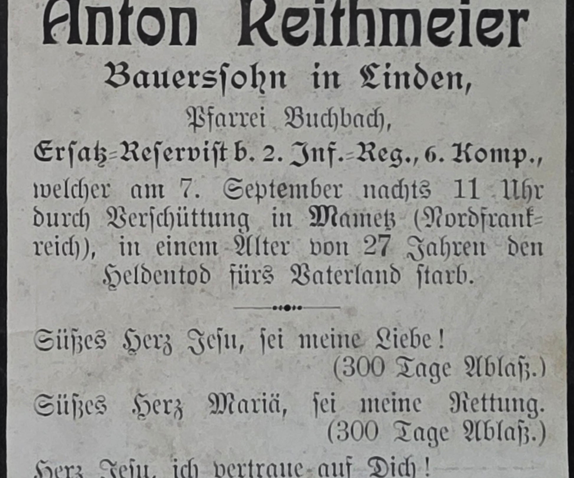 Sterbebild Infanterist Buchbach 6. Komp. Inf. Regt. 2 Mametz Frankreich