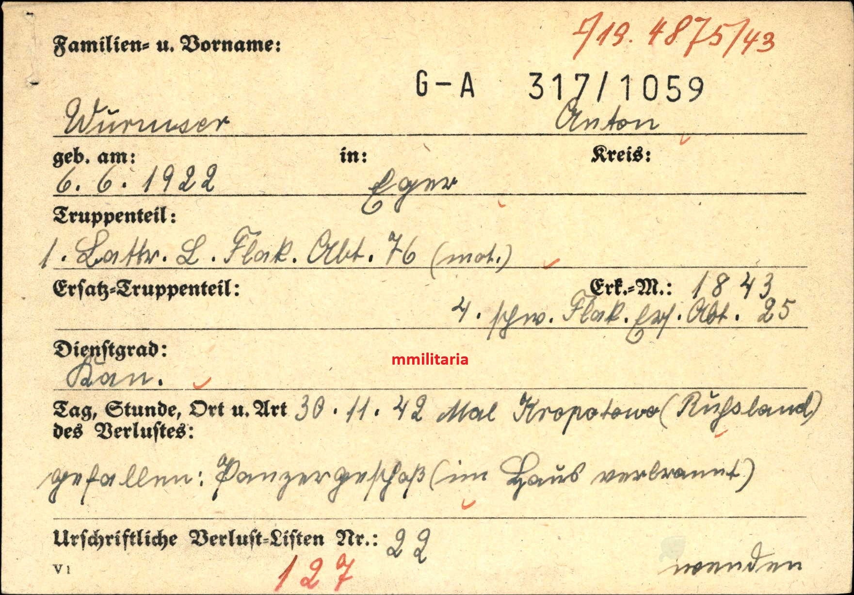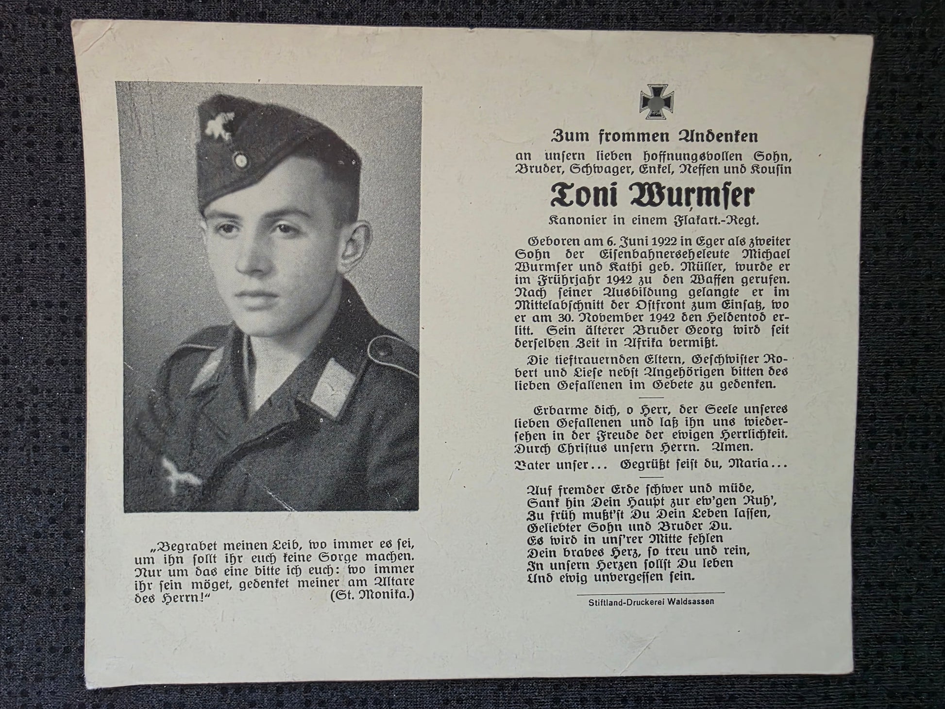 Sterbebild Kanonier Eger 1. Batterie Leichte Flak Abt. 76 (Mot) Kropotowo Russland