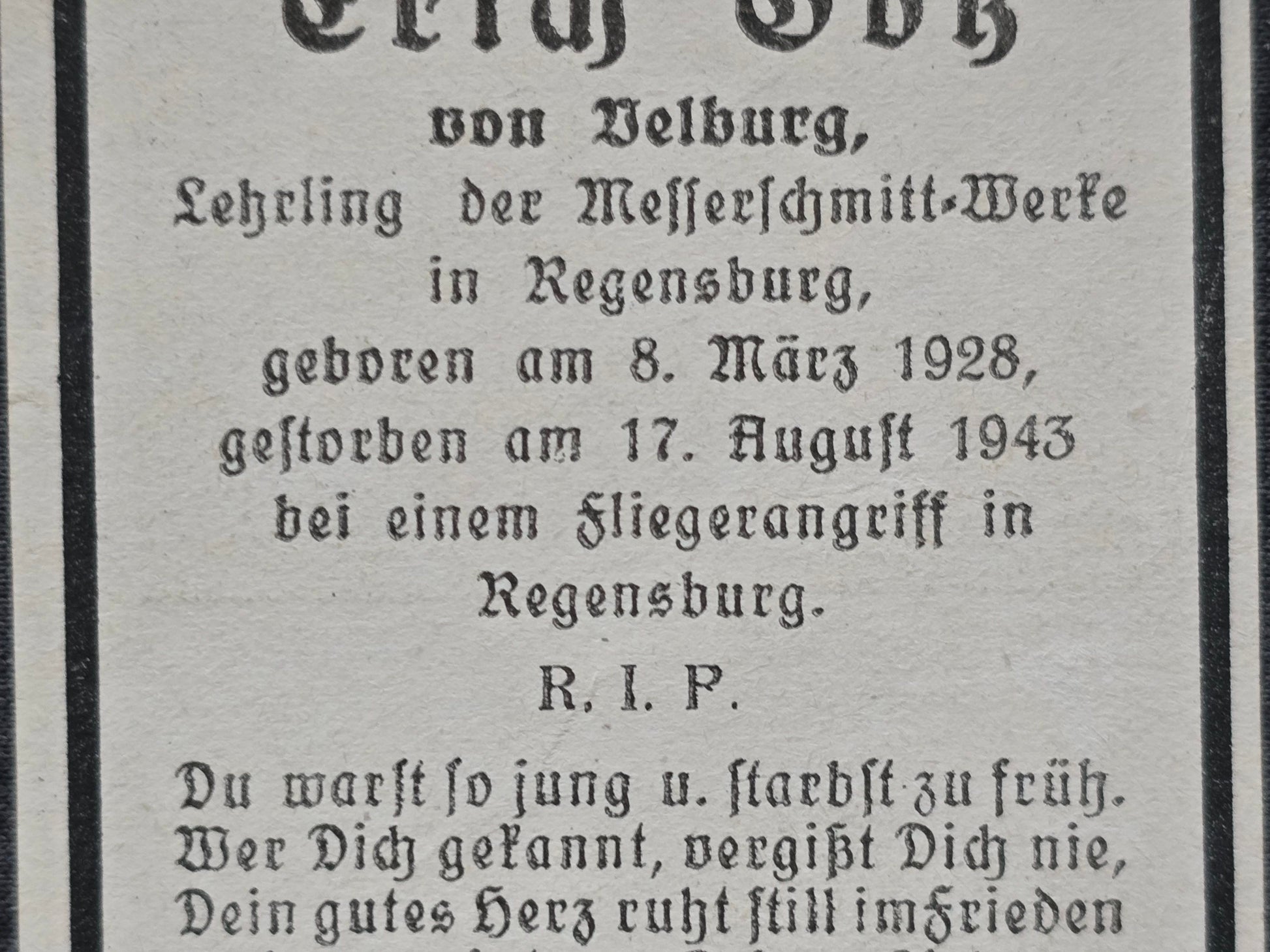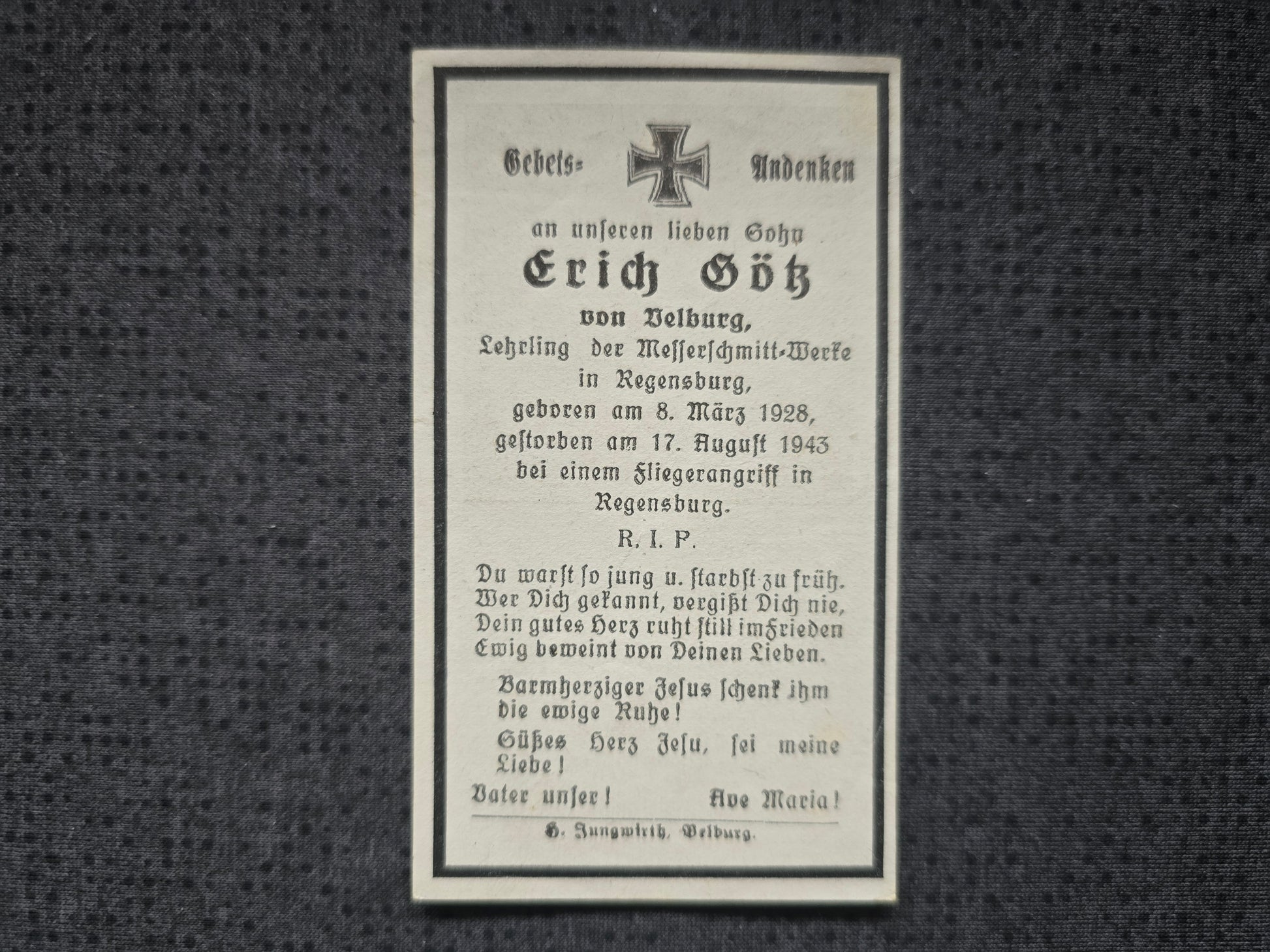 Sterbebild Lehrling Velburg Messerschmitt-Werke 16 Jahre Fliegerangriff Regensburg