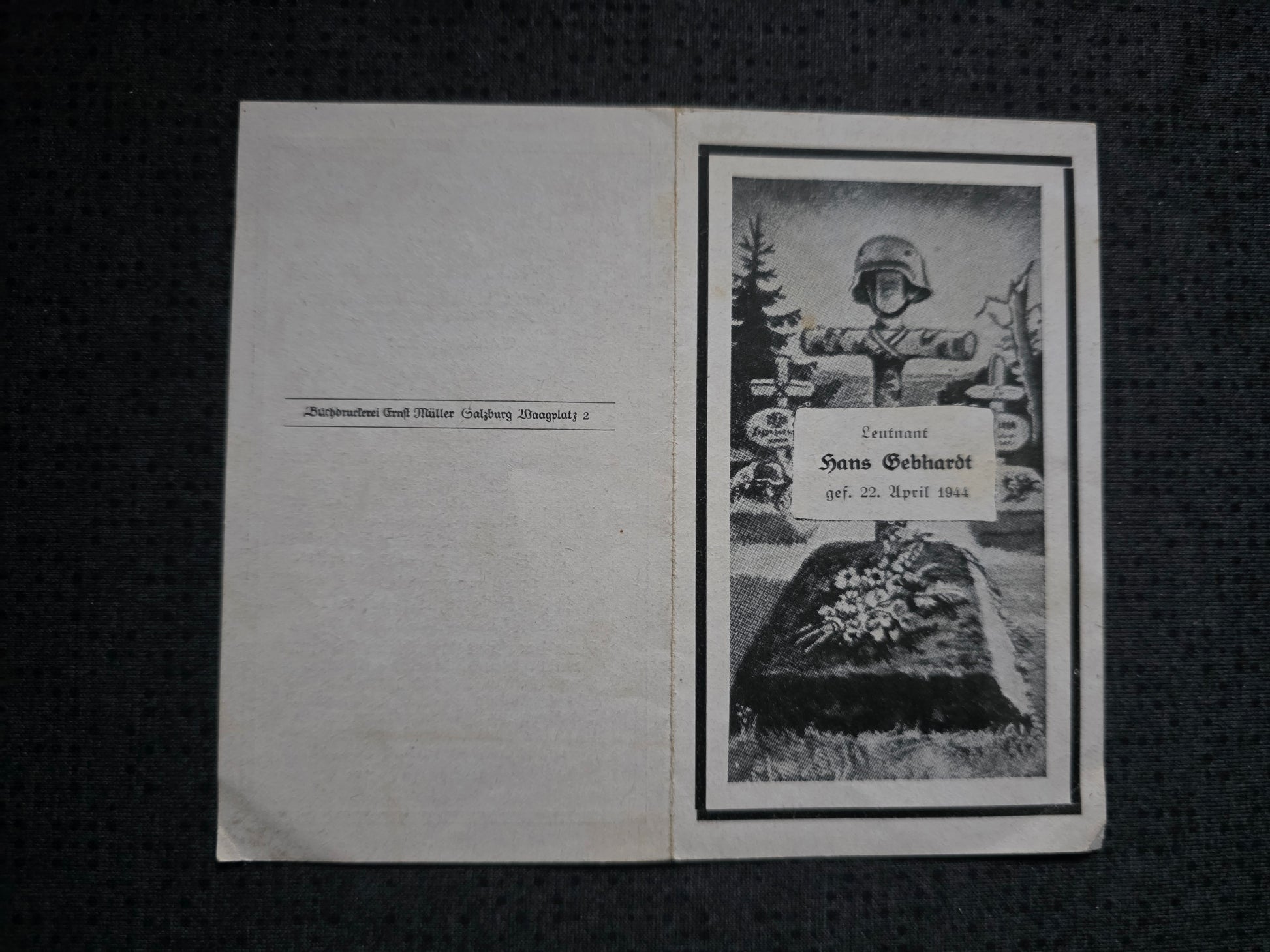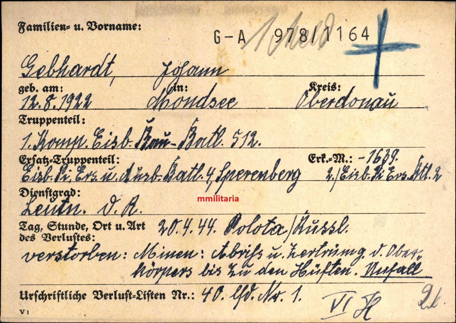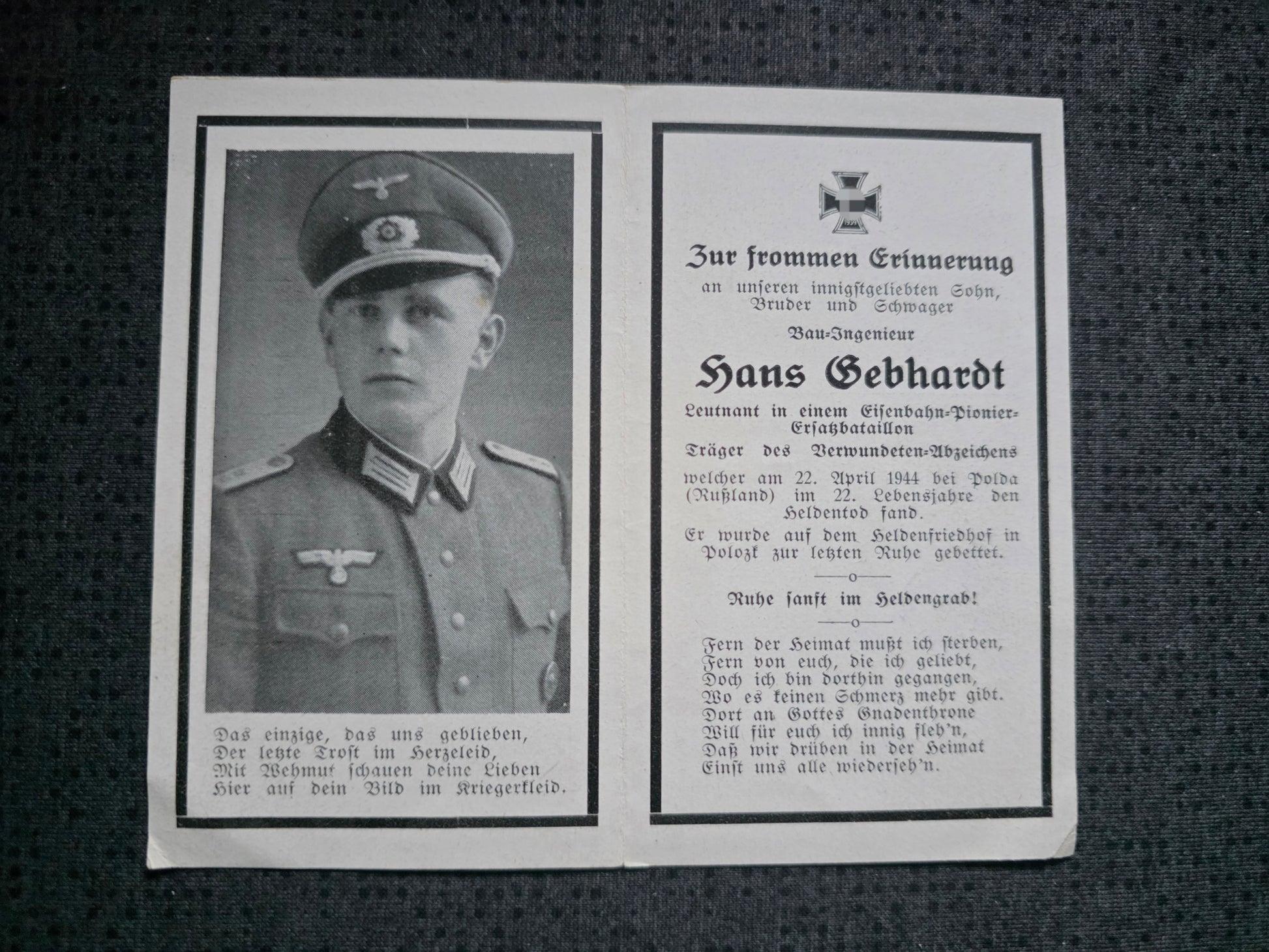 Sterbebild Leutnant Mondsee 1. Komp. Eisenbahn Bau-Btl. 512 Polota Weissrussland