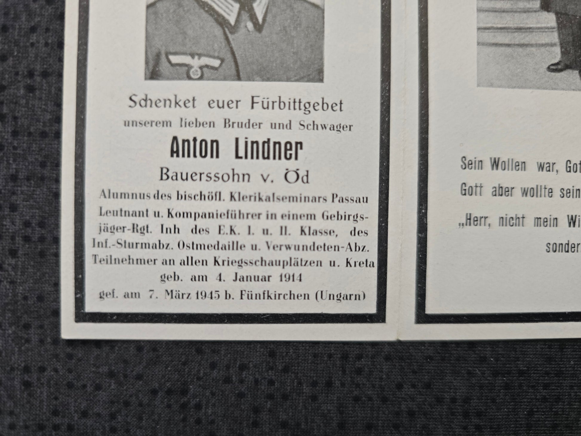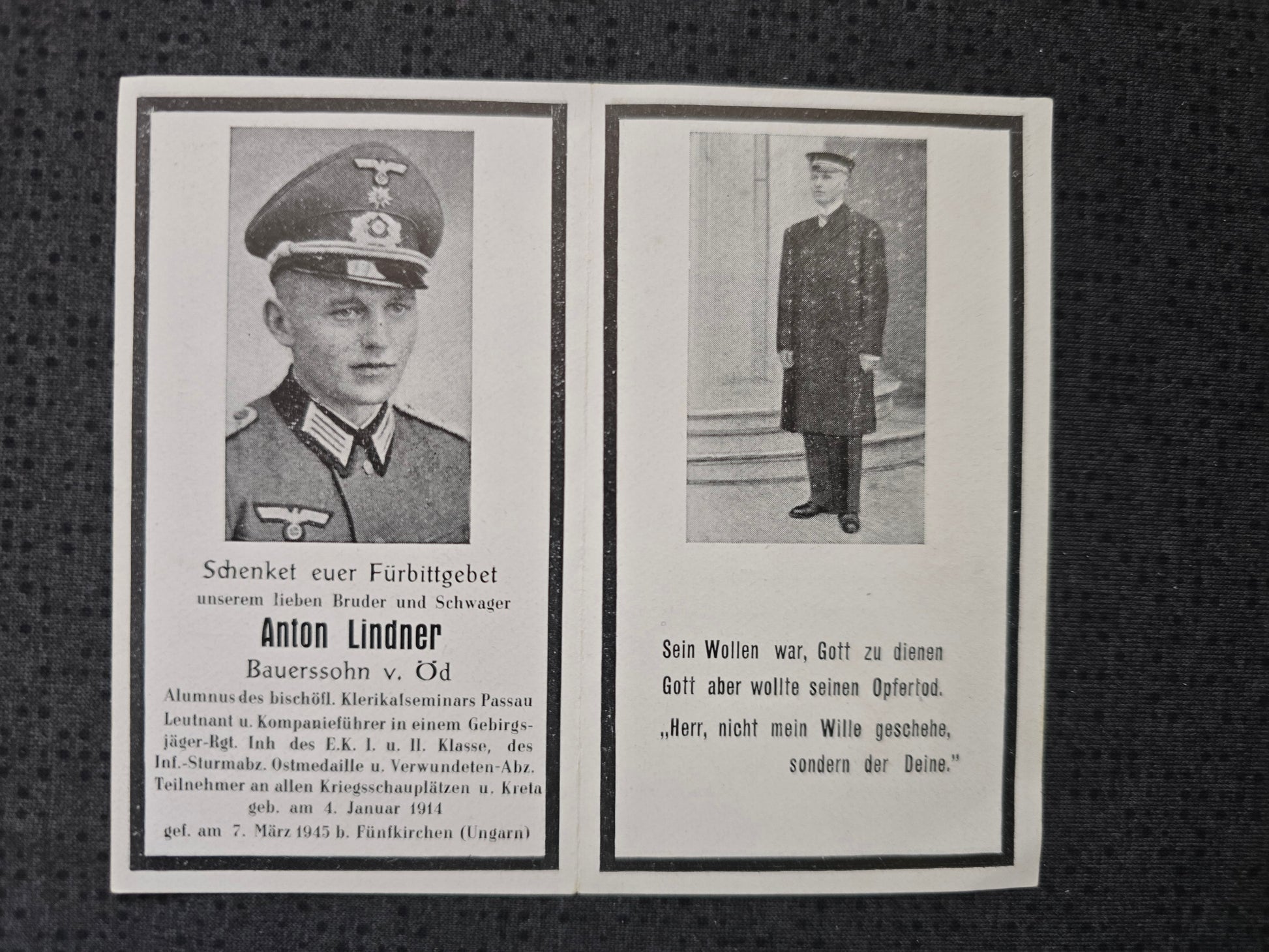Sterbebild Leutnant Öd Gebirgsjäger Regt. EK I&II Kreta Endkampf Draubrückenkopf Dravaszabolcs Pecs Fünfkirchen Ungarn