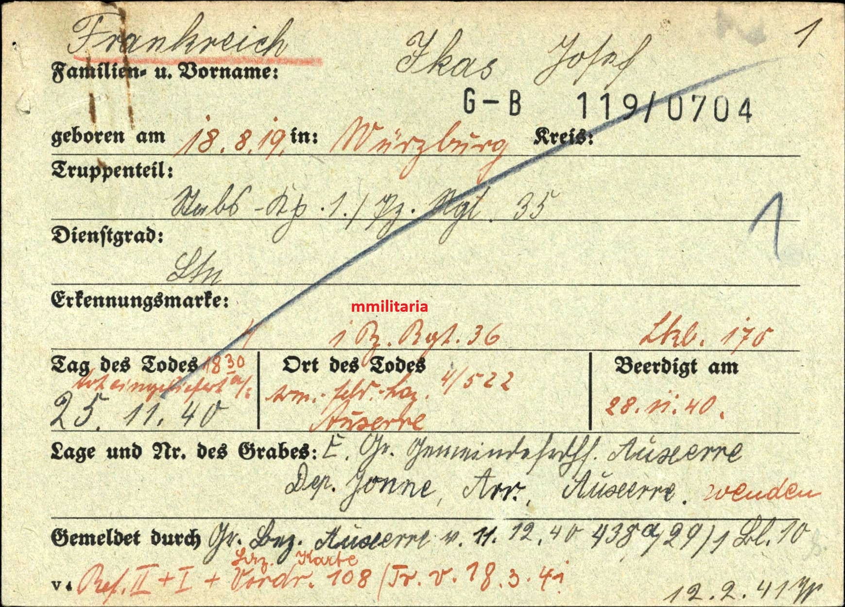 Gefallen am 25.11.1940 bei Auxerre (Frankreich)