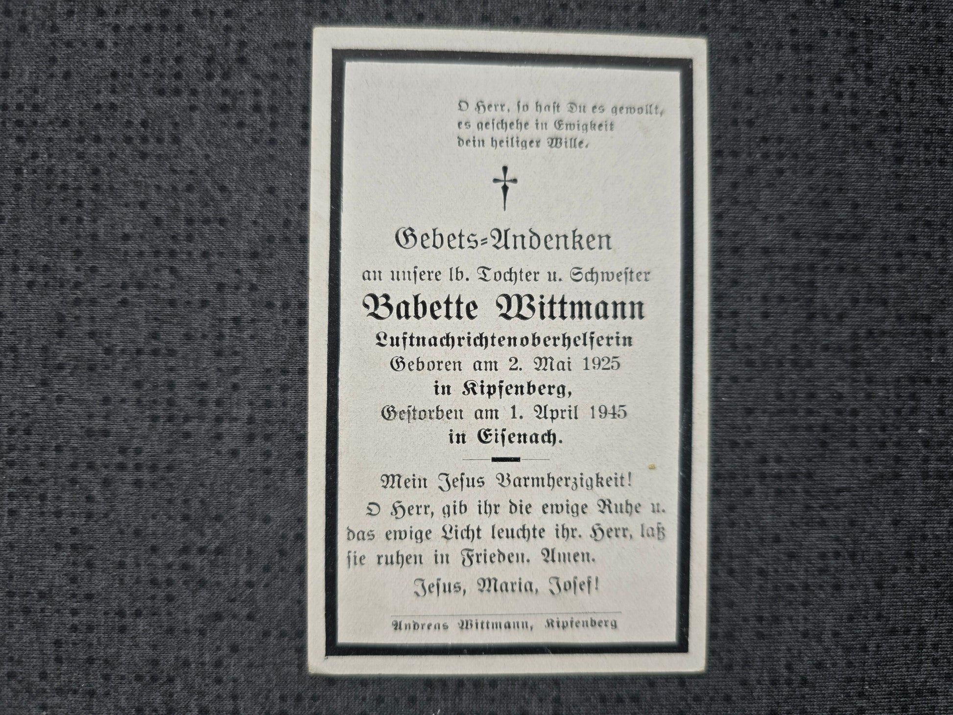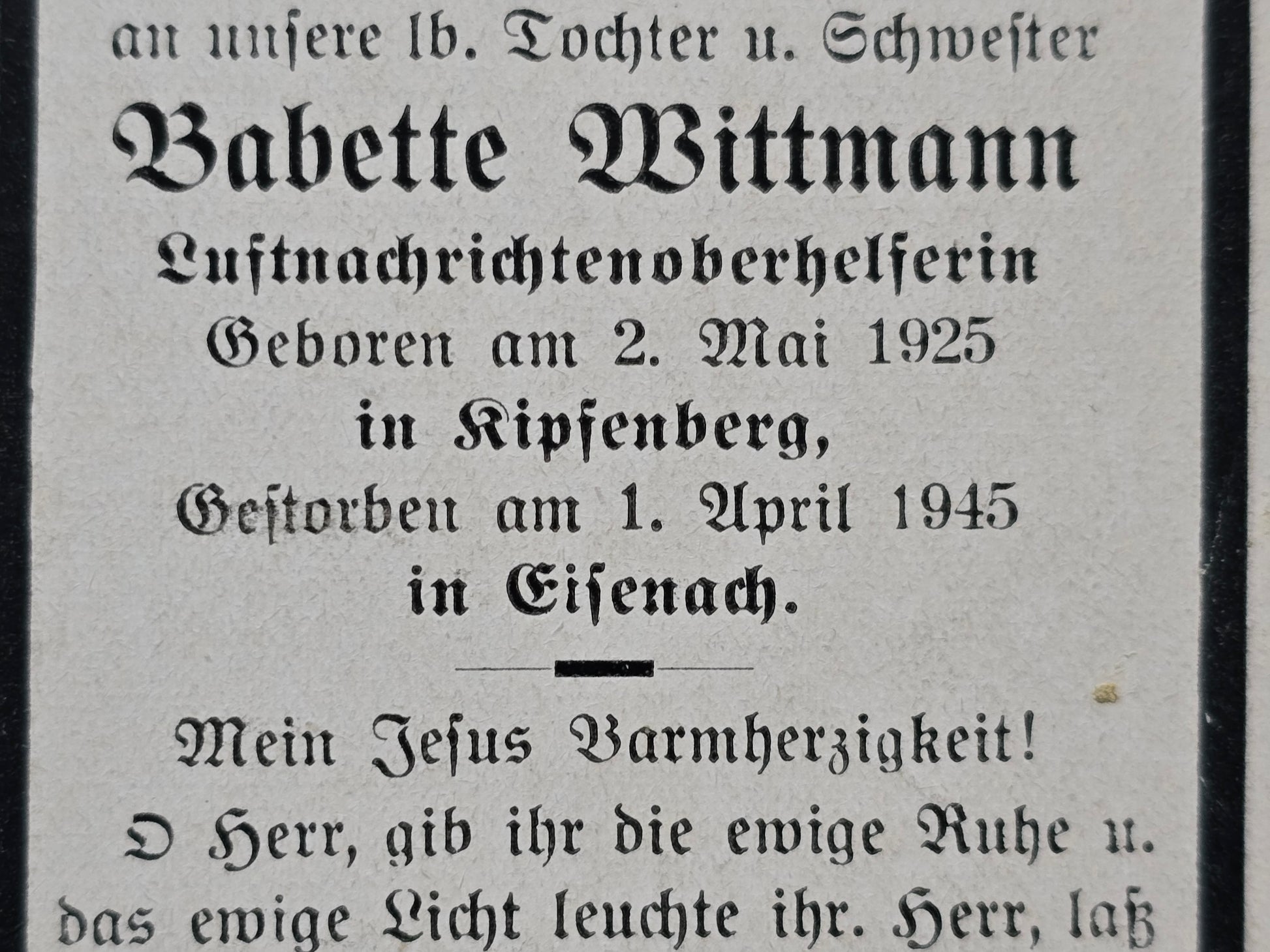 Sterbebild Luftnachrichtenoberhelferin Kipfenberg Endkampf Eisenach Thüringen