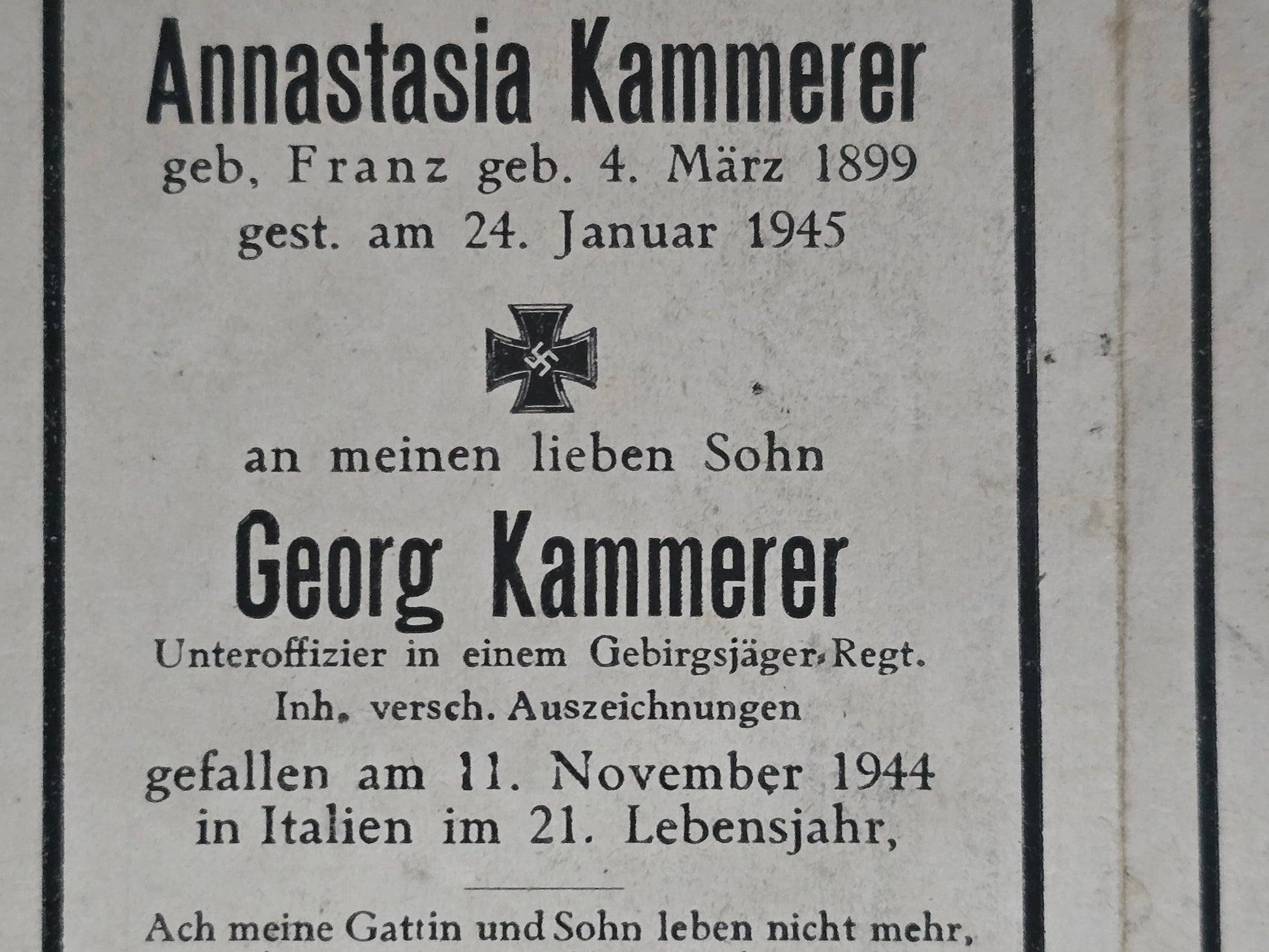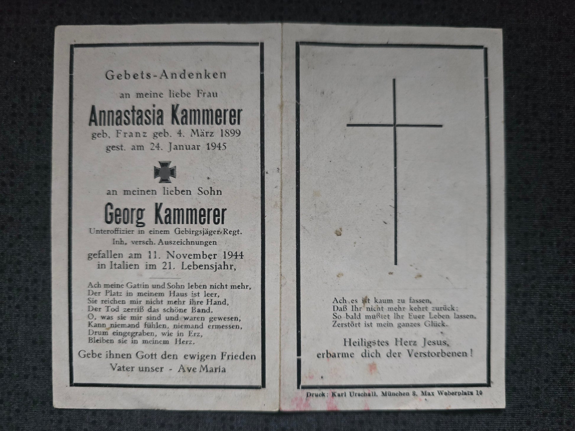 Sterbebild Mutter & Sohn Unteroffizier Gebirgsjäger Regt. Futa-Pass Italien