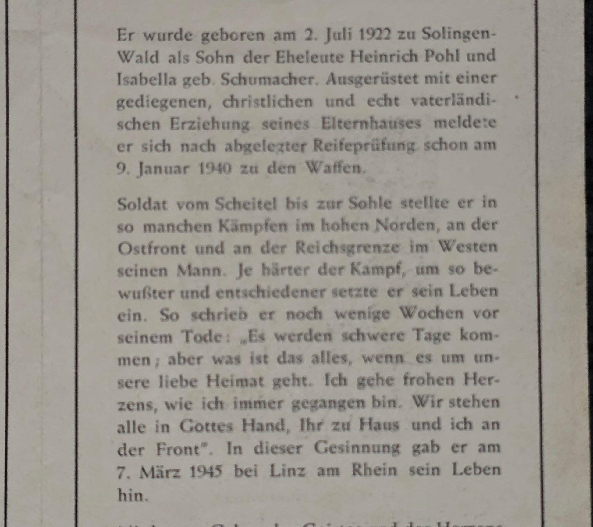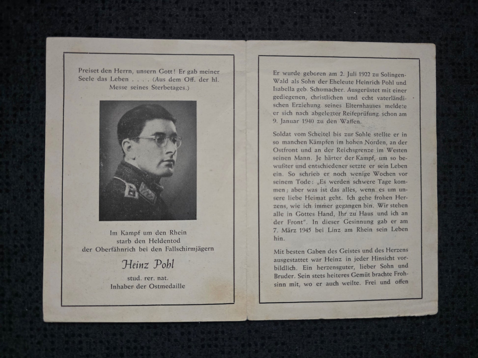 Sterbebild Oberfähnrich Solingen Fallschirmjäger Kampf um den Rhein Linz Lommel Belgien