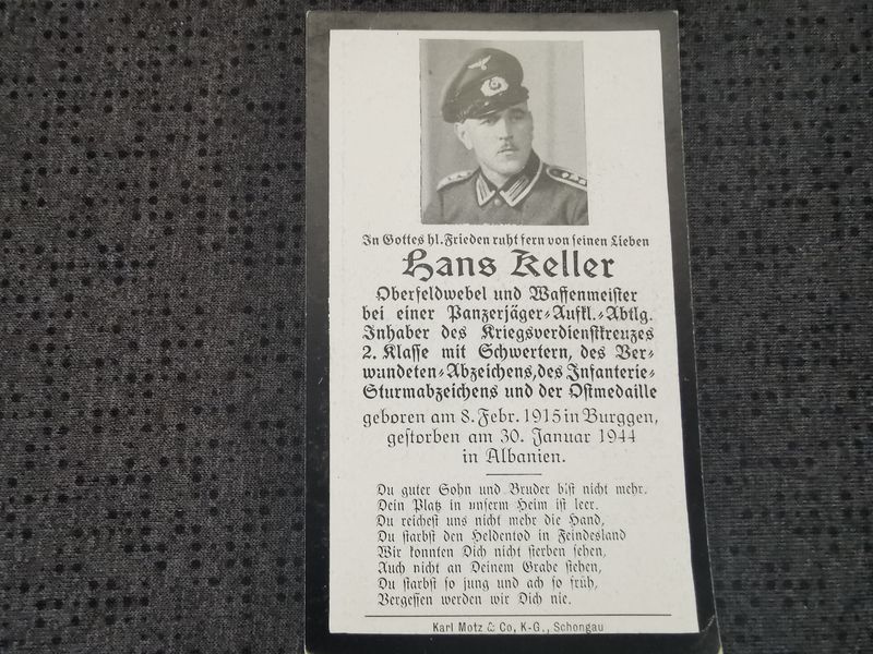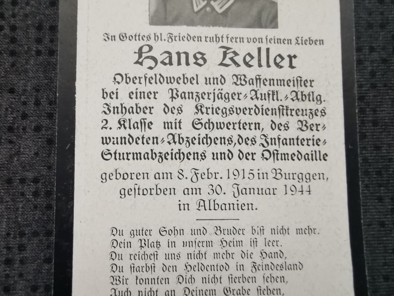 Sterbebild Oberfeldwebel Burggen Waffenmeister Panzerjäger Aufkl. Abt. EK II KvK ISA Albanien