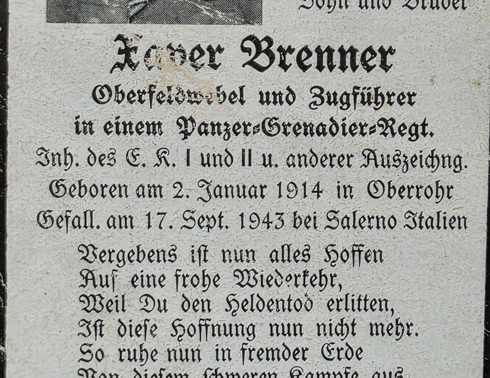 Sterbebild Oberfeldwebel & Zugführer Oberrohr 6. Komp. Pz.-Gren. Regt. 67 Salerno Italien