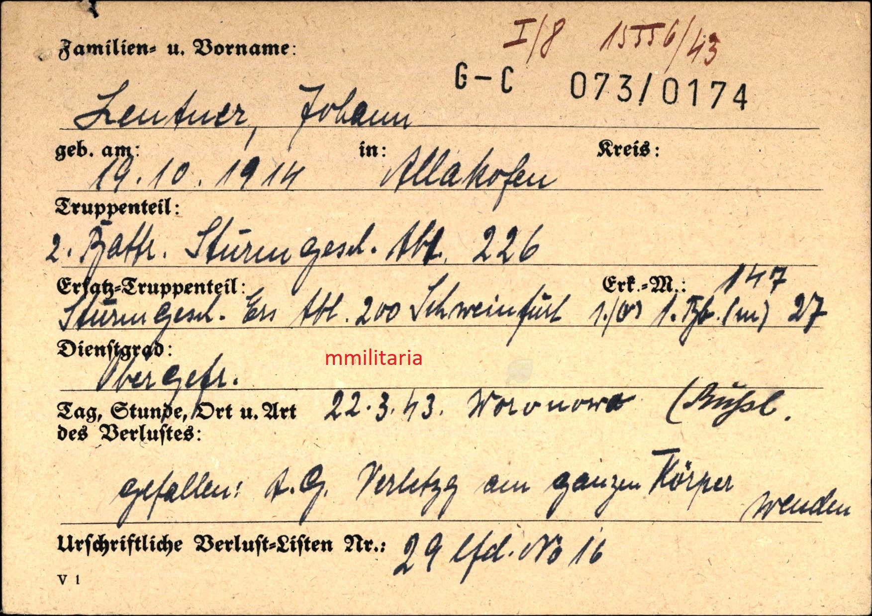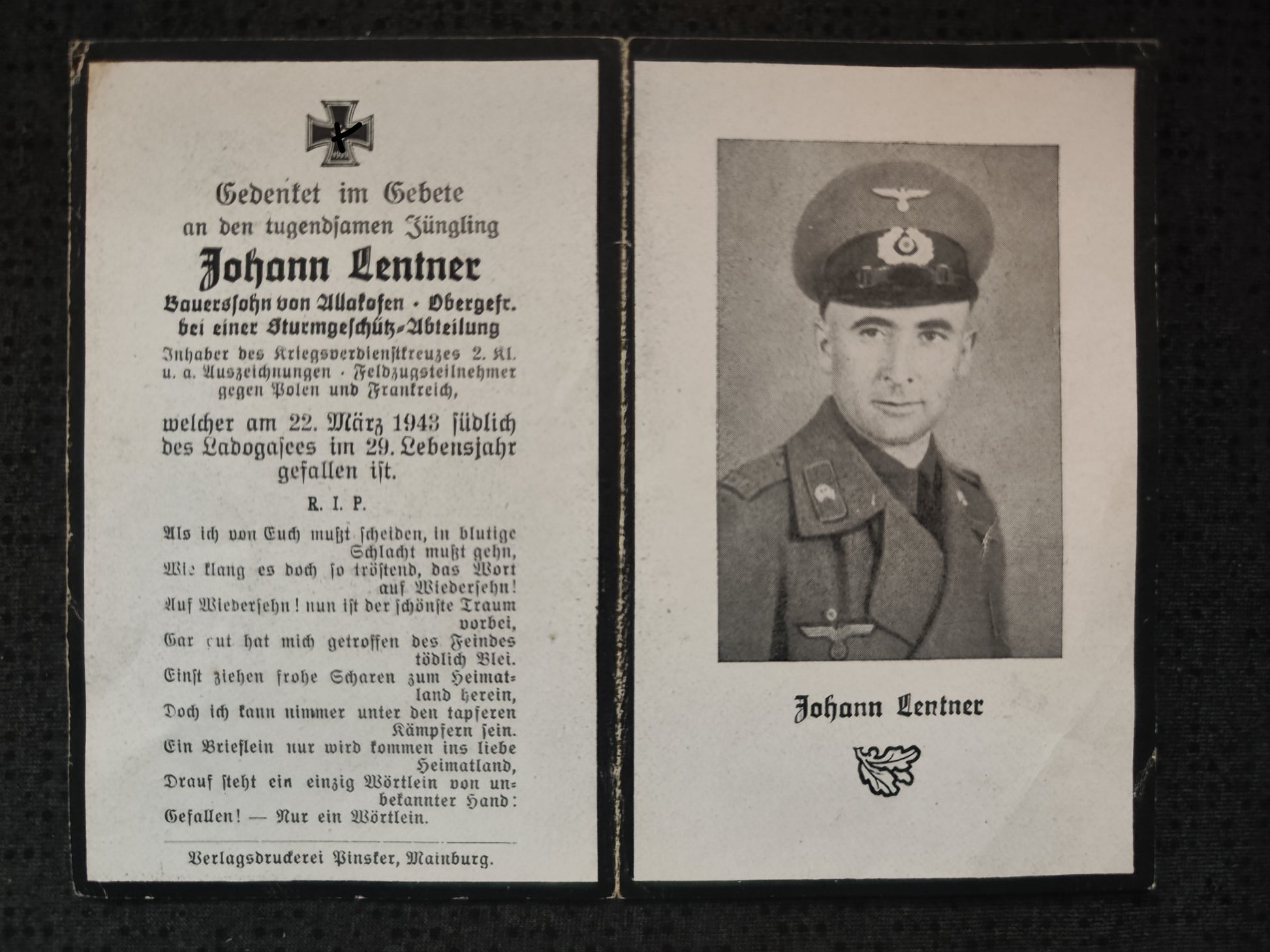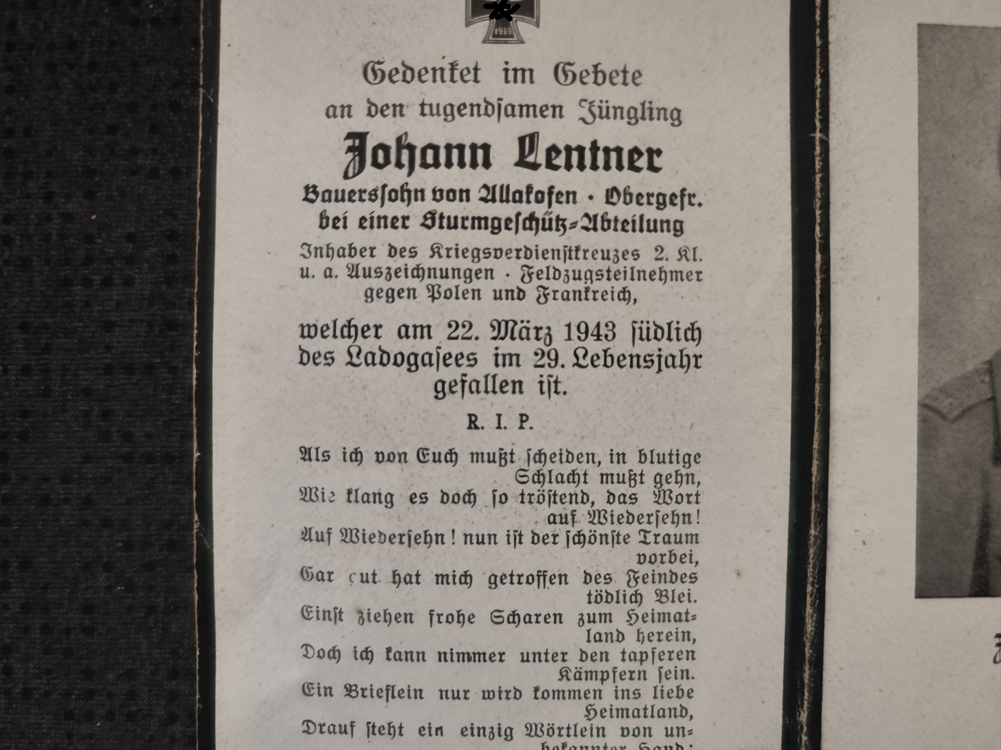 Sterbebild Obergefreiter Allakofen 2. Batterie Sturmgeschütz Abt. 226 Ladogasee Worowowo Russland