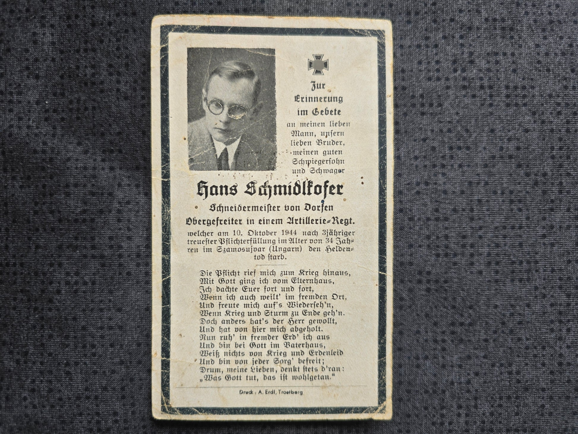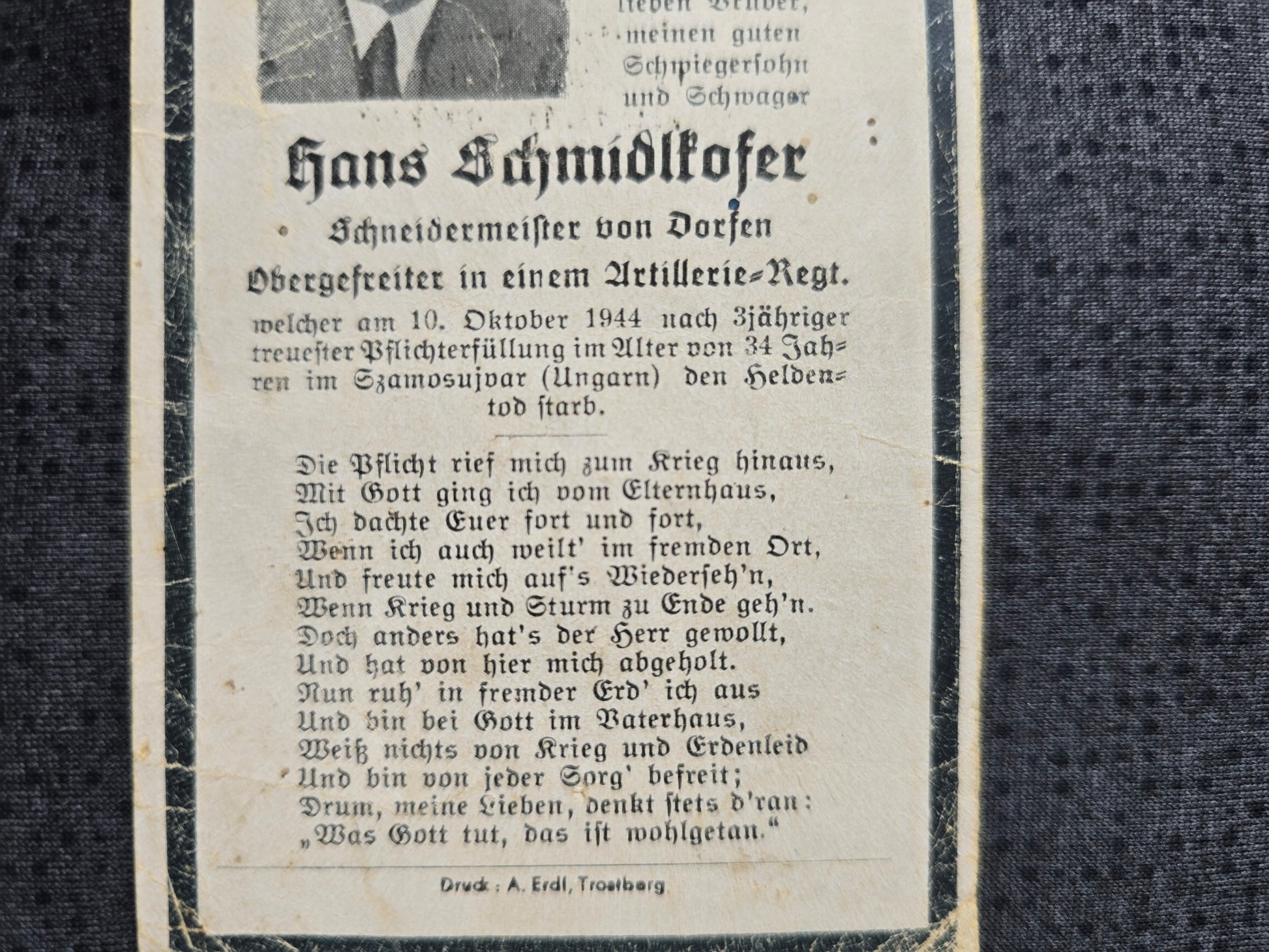 Sterbebild Obergefreiter Dorfen Artillerie Regt. Szamosujvar Ungarn