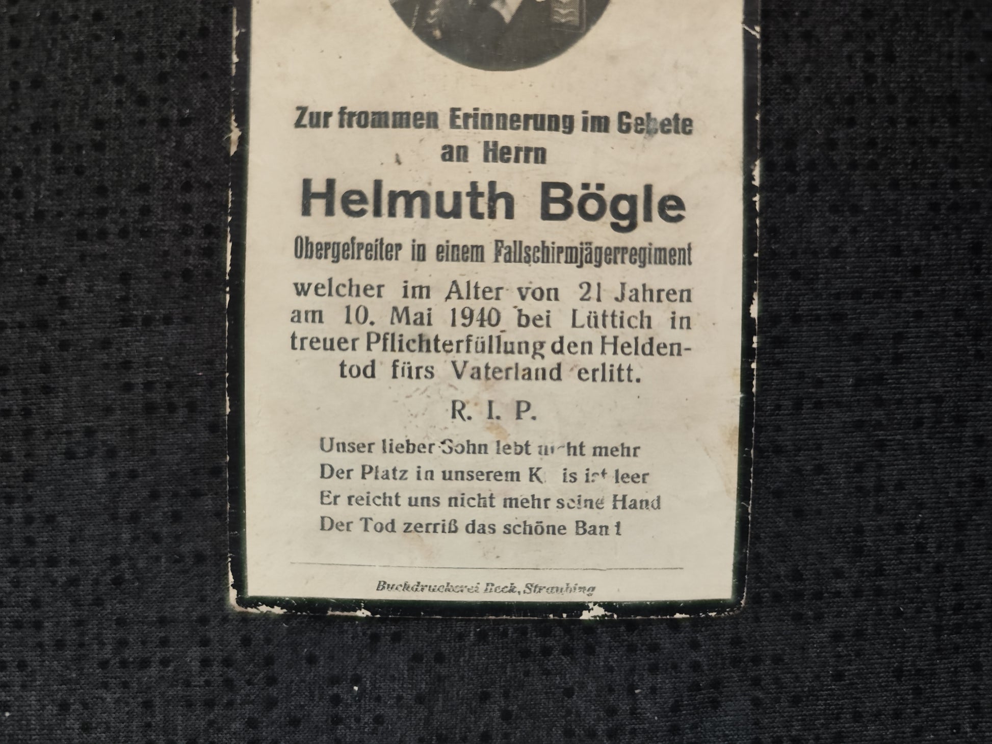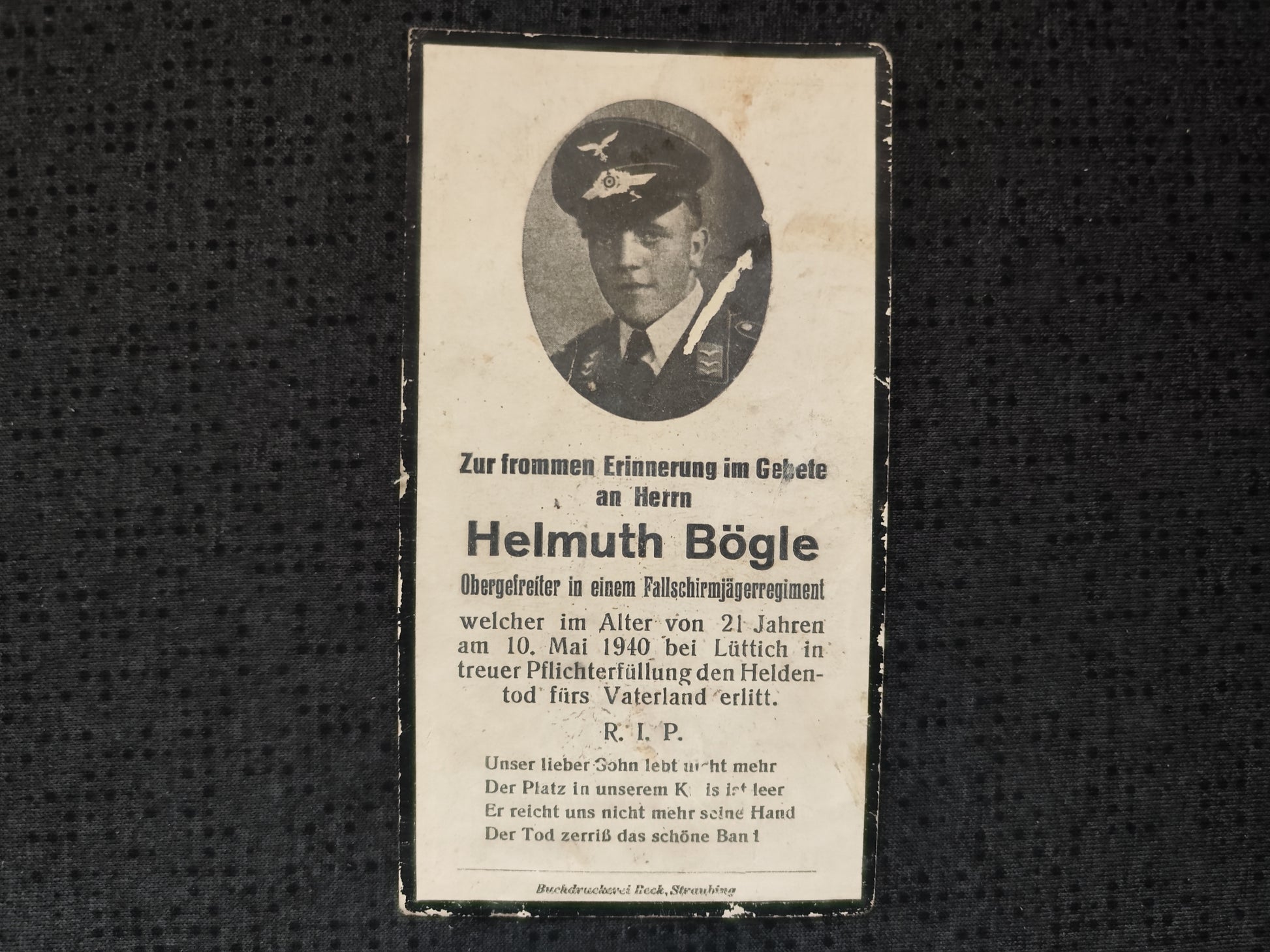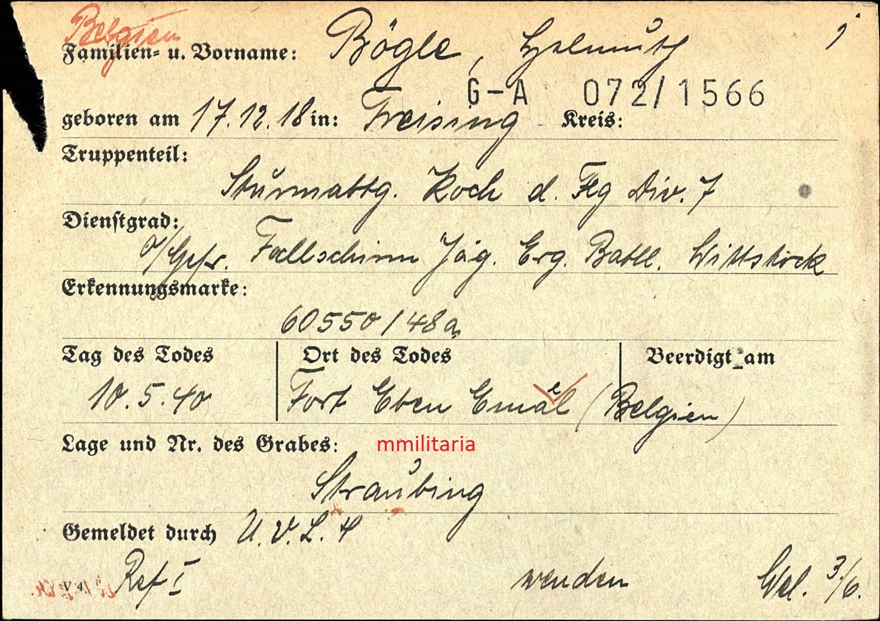 Sterbebild Obergefreiter Freising Fallschirmjäger Regt. Sturmabteilung Koch d. Flg. Div. 7 Fort Eben Emael Lüttich Belgien