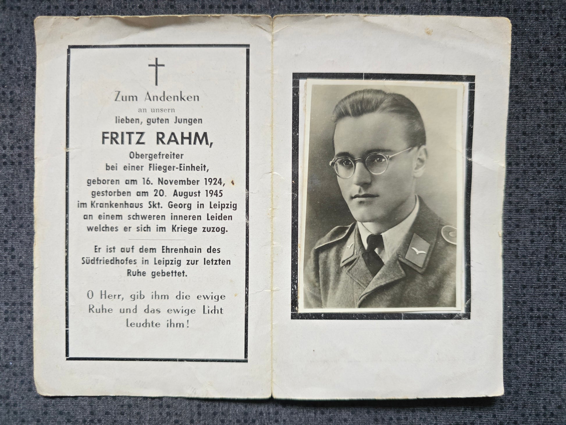Sterbebild Obergefreiter Flieger-Einheit Endkampf Echtfoto Leipzig Südfriedhof Deutschland