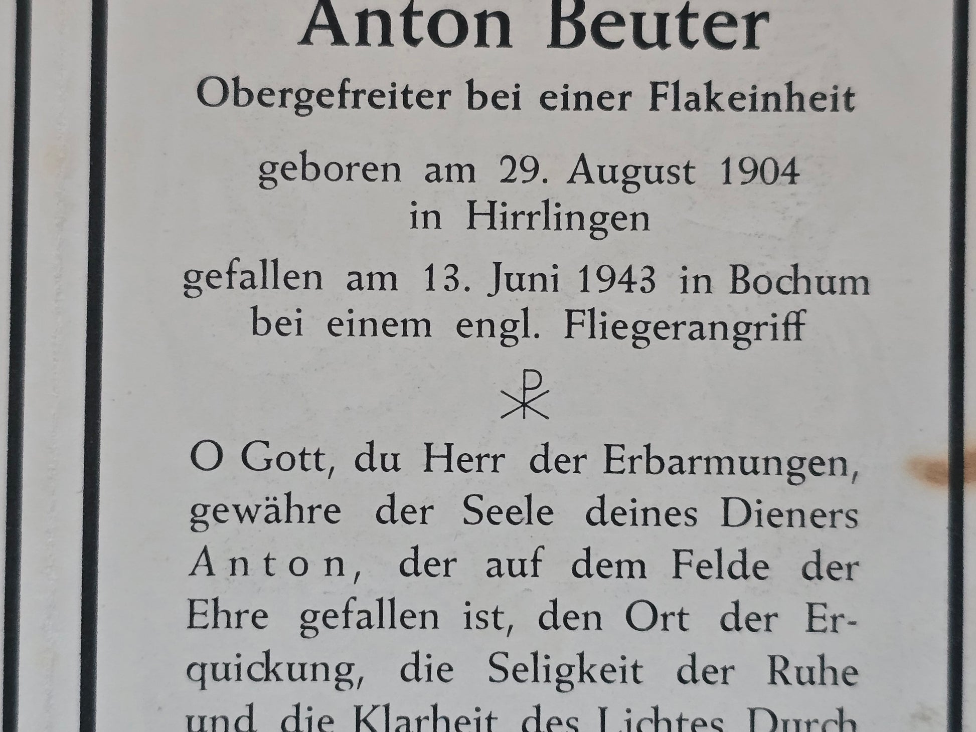 Sterbebild Obergefreiter Hirrlingen schwere Flak Batterie 12 Engl. Fliegerangriff Bochum
