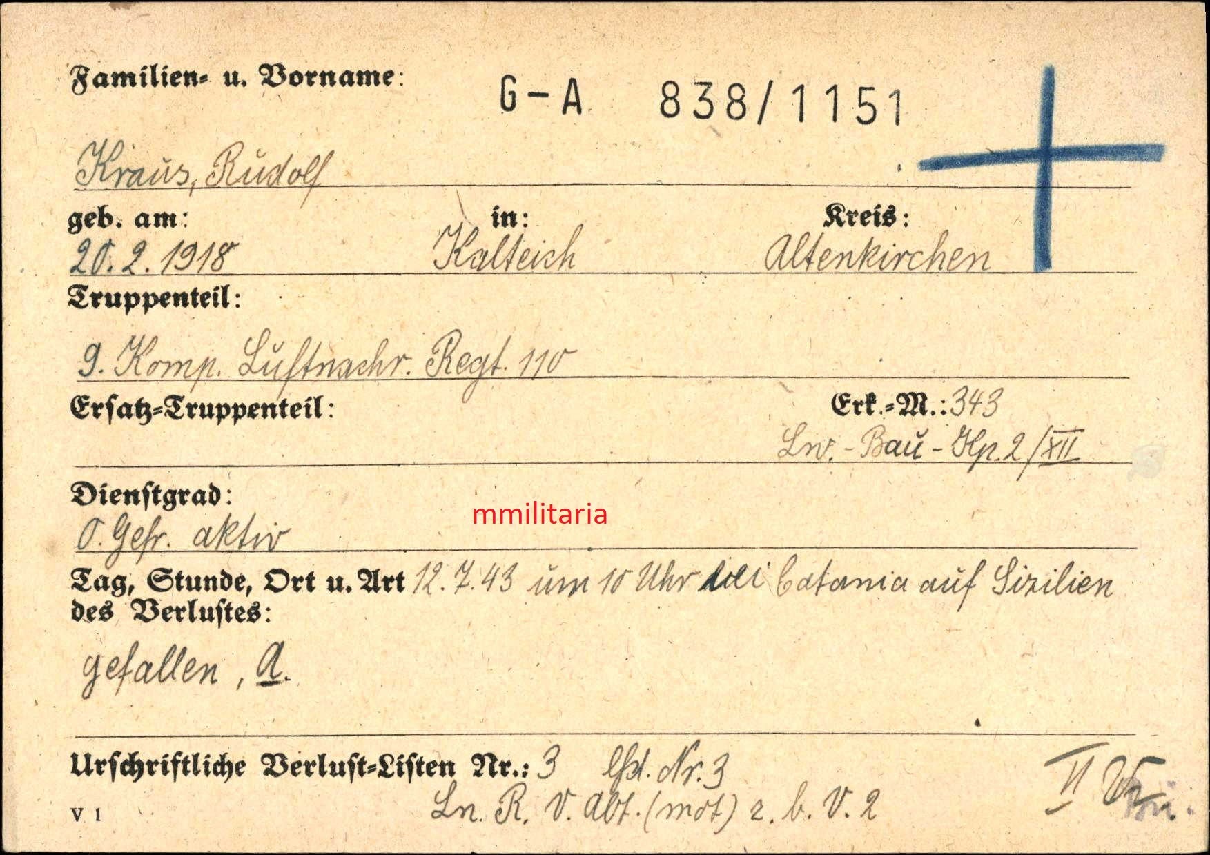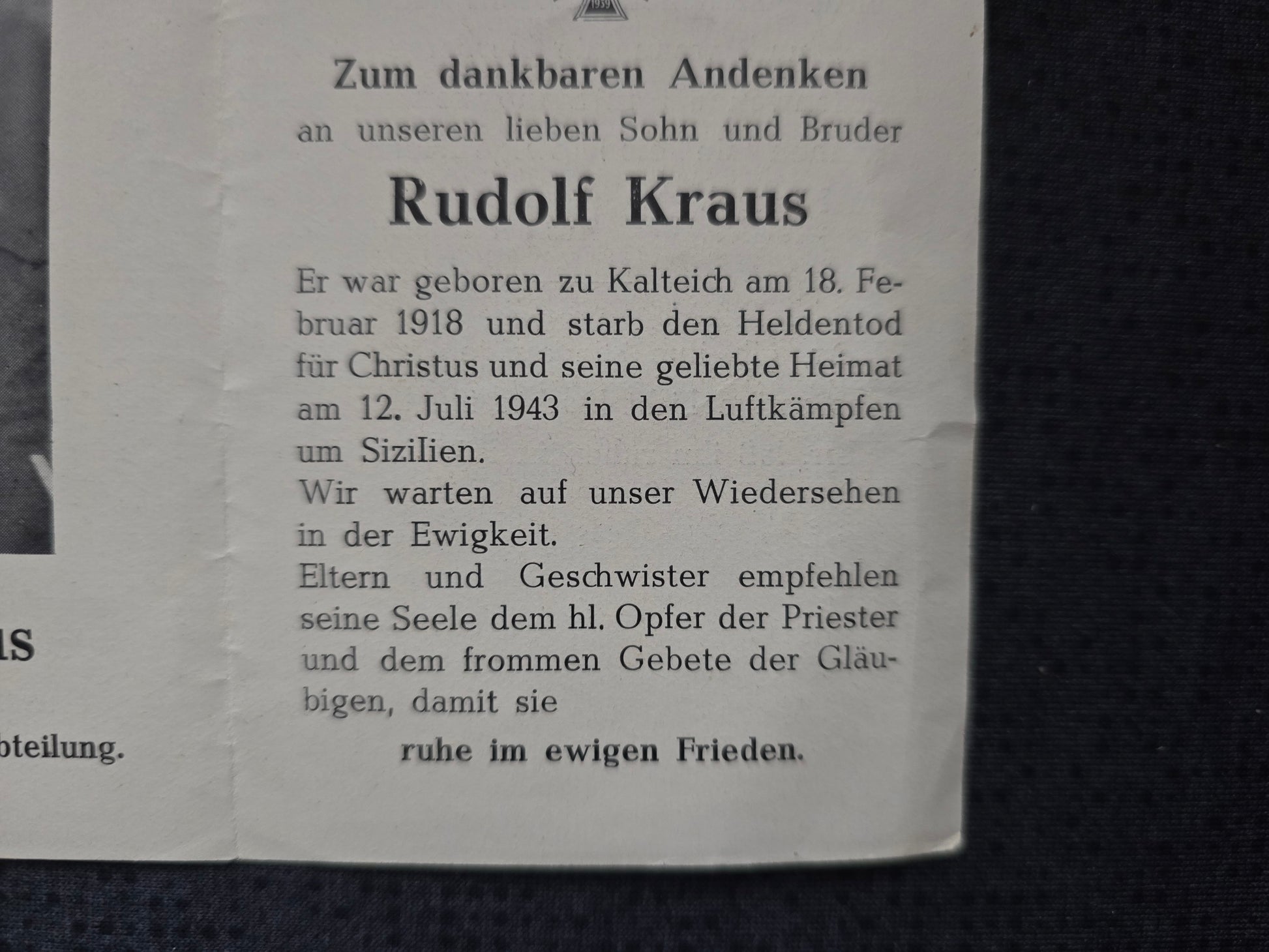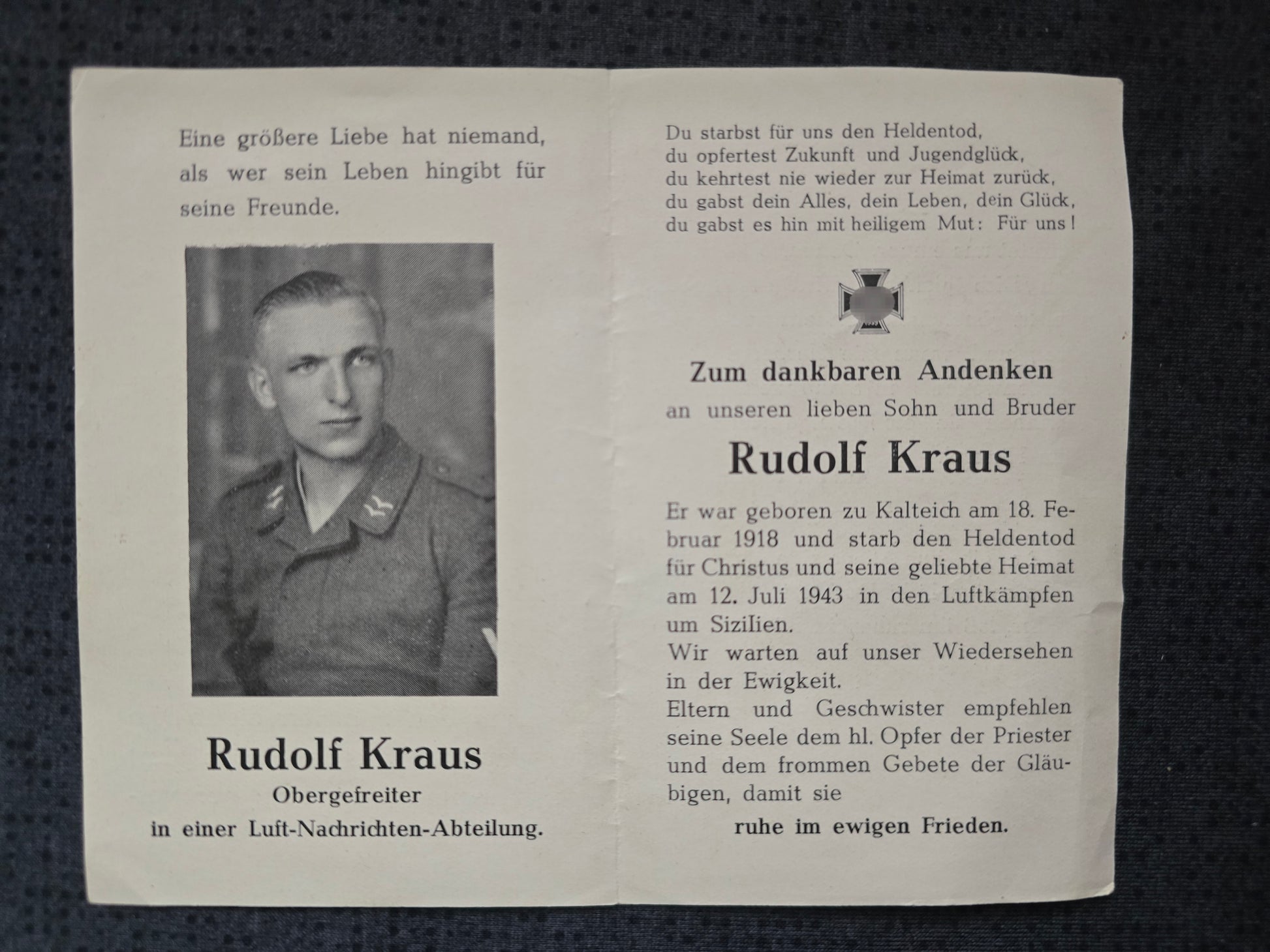 Sterbebild Obergefreiter Kalteich 9. Komp. Luftnachrichten Regt. 110 Luftkampf Catania Sizilien Italien
