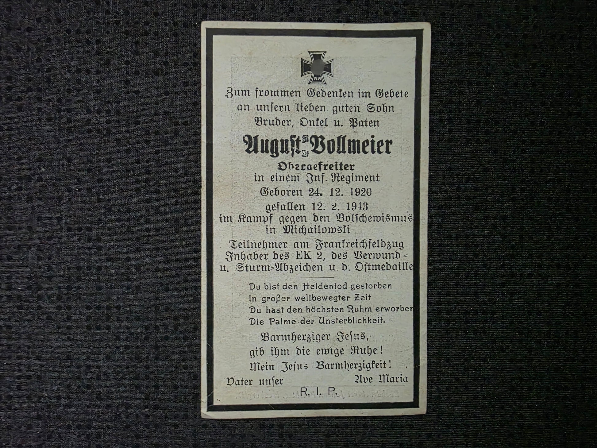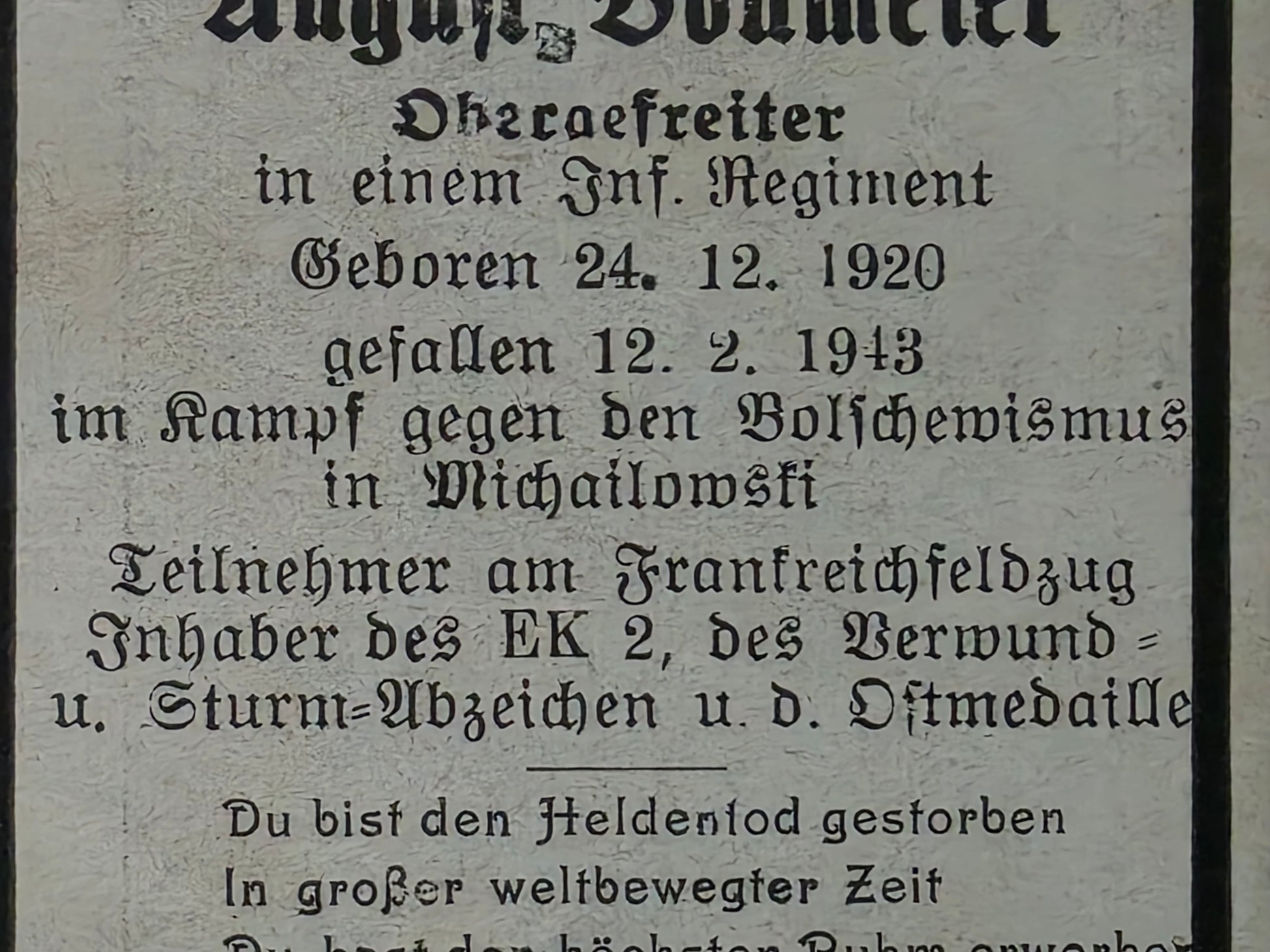 Sterbebild Obergefreiter Karlshuld Gaitolowo Michailowsk Russland