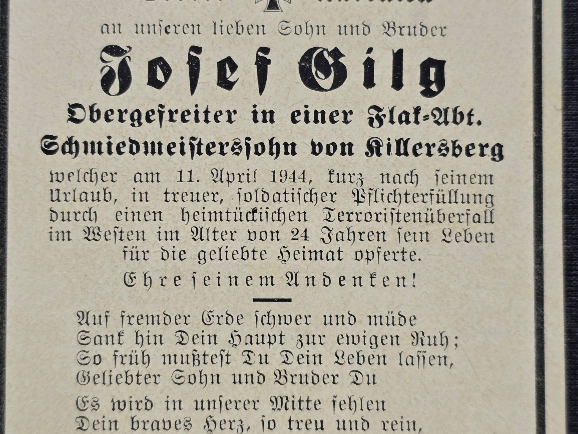 Sterbebild Obergefreiter Killersberg 3. Batterie Leichte Flak Abt. 752 Guipavas Ploudaniel-Lesneven Frankreich