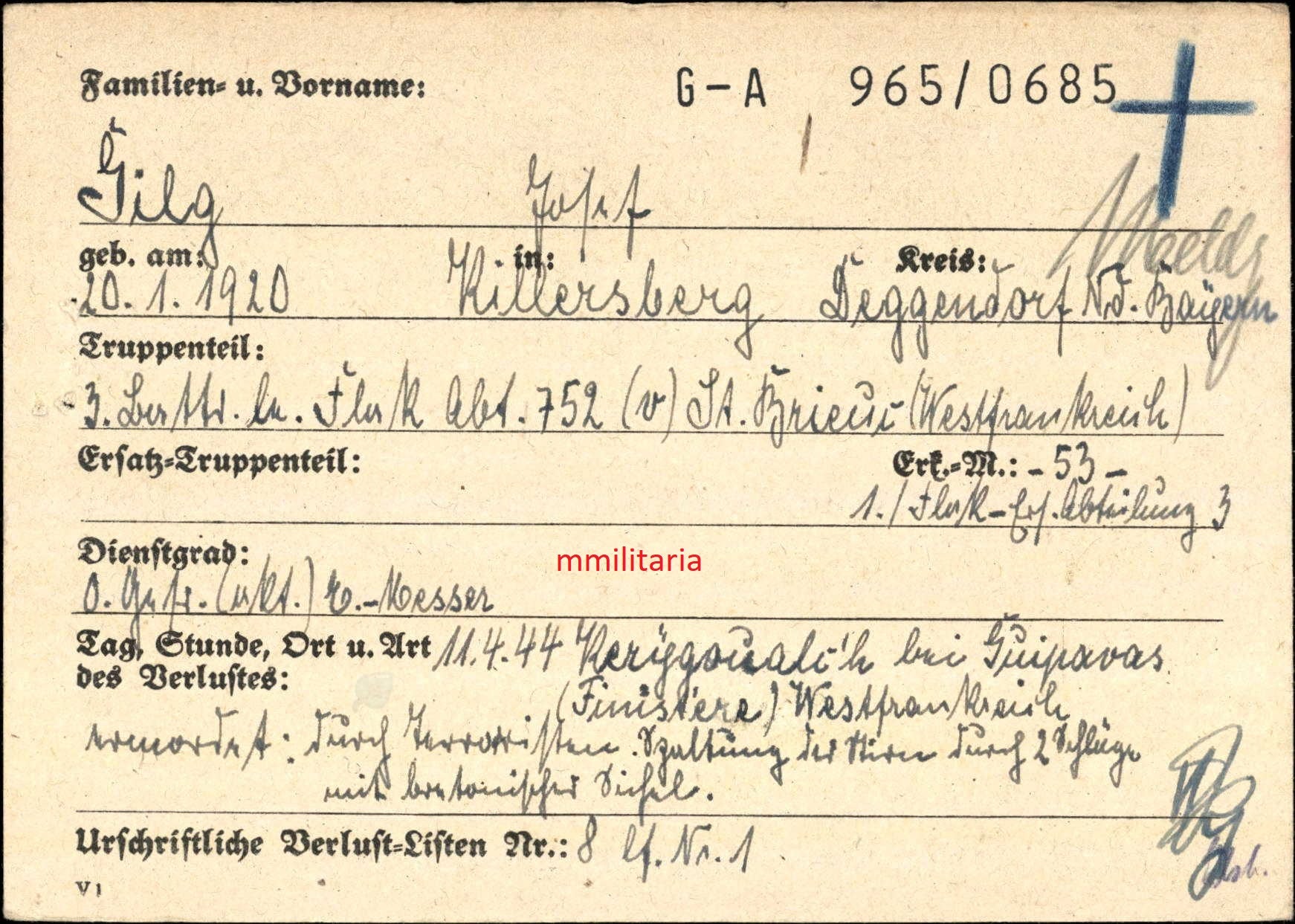 Gefallen am 11.04.1944 bei Guipavas (Frankreich)