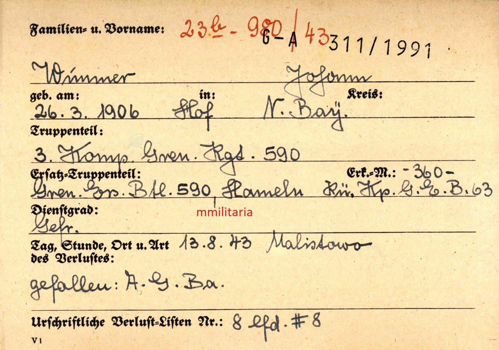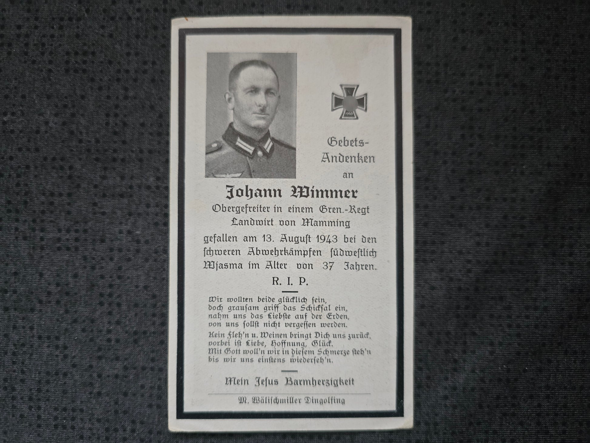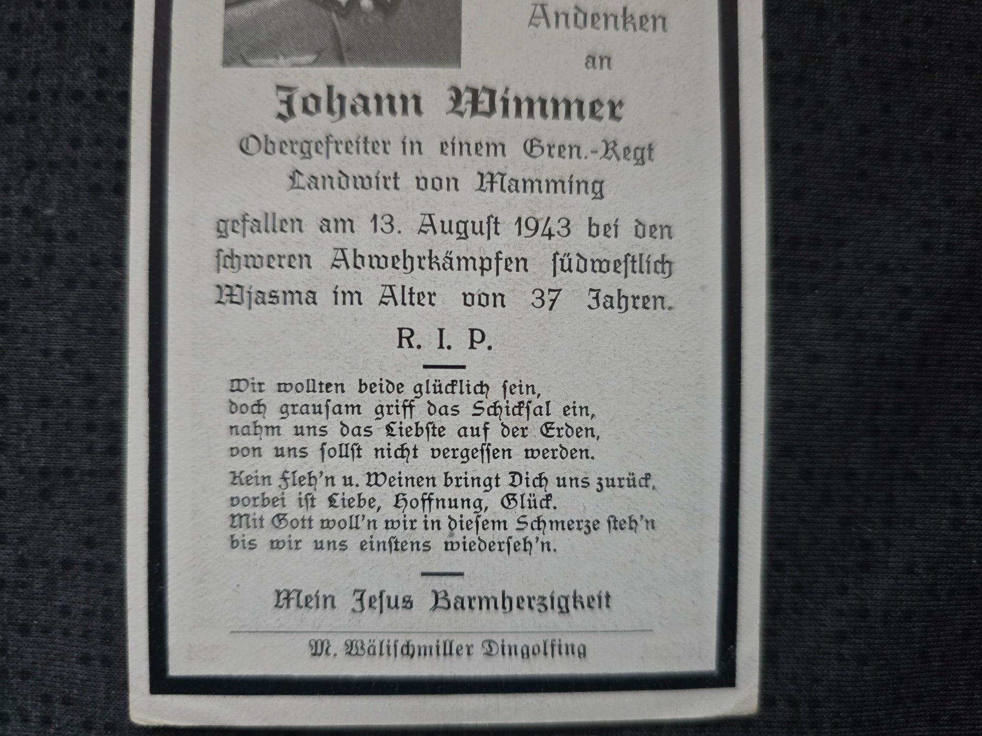 Sterbebild Obergefreiter Mamming 3. Komp. Gren. Regt. 590 Wjasma Russland