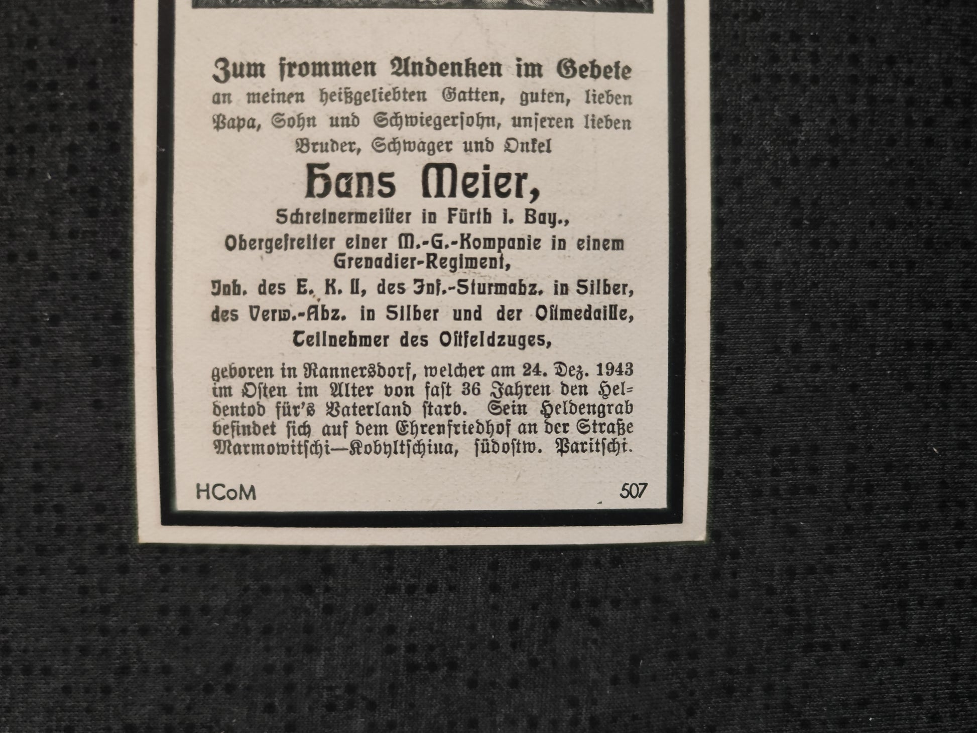 Sterbebild Obergefreiter Fürth MG-Kompanie Grenadier Regt. EK II ISA Silber Osten