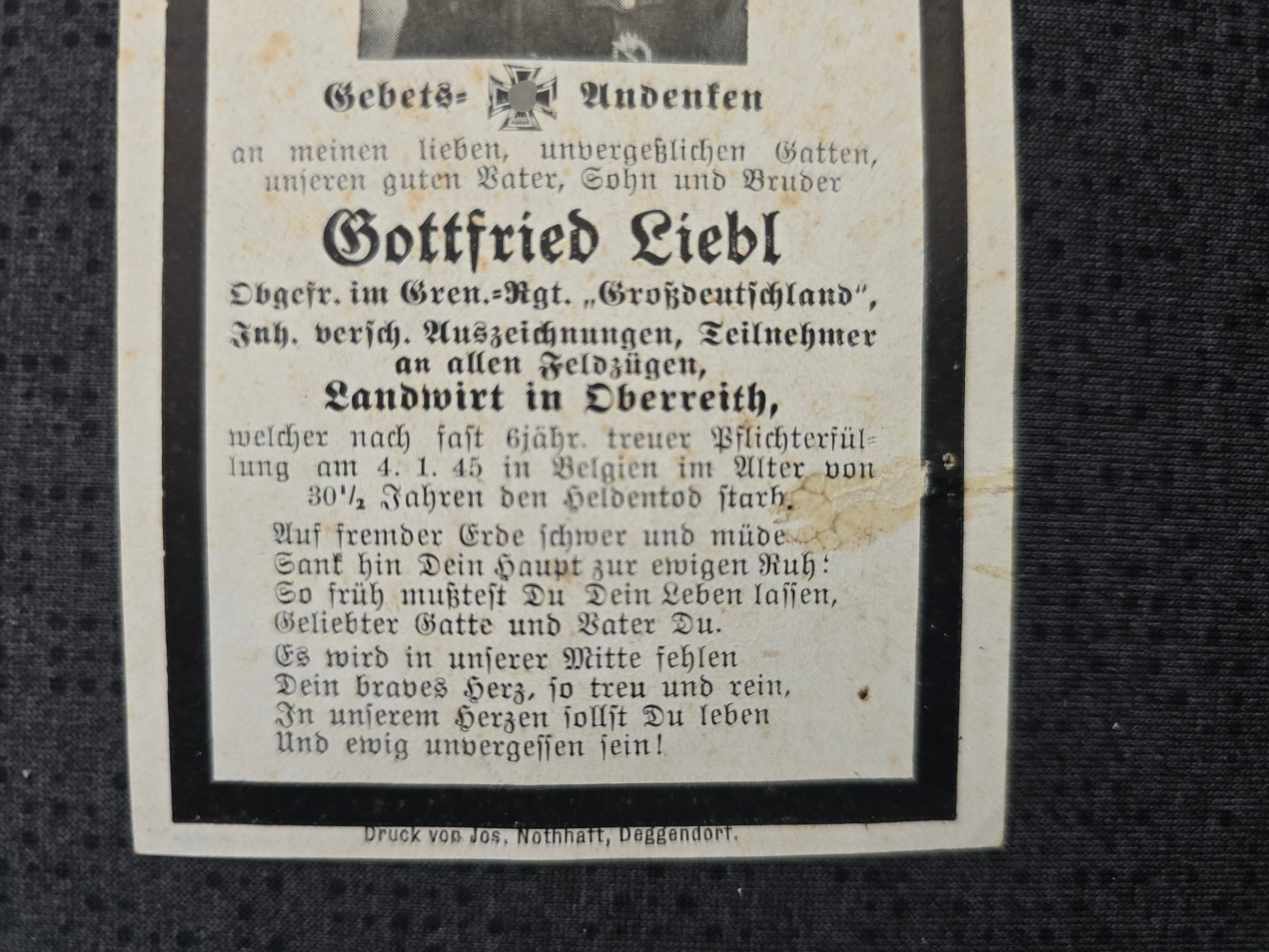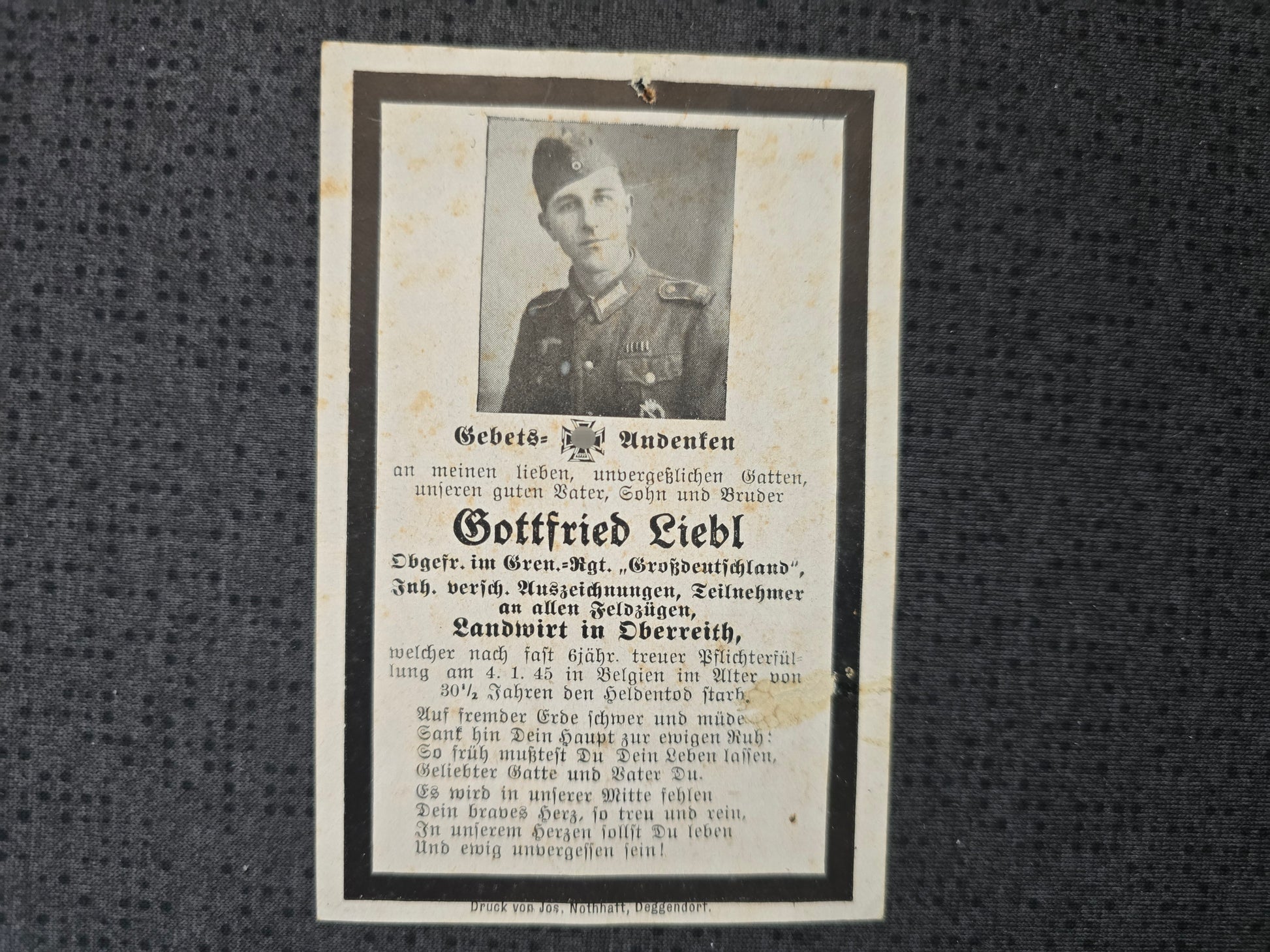 Sterbebild Obergefreiter Oberreith Grenadier Regt. "Großdeutschland" GD Endkampf Belgien