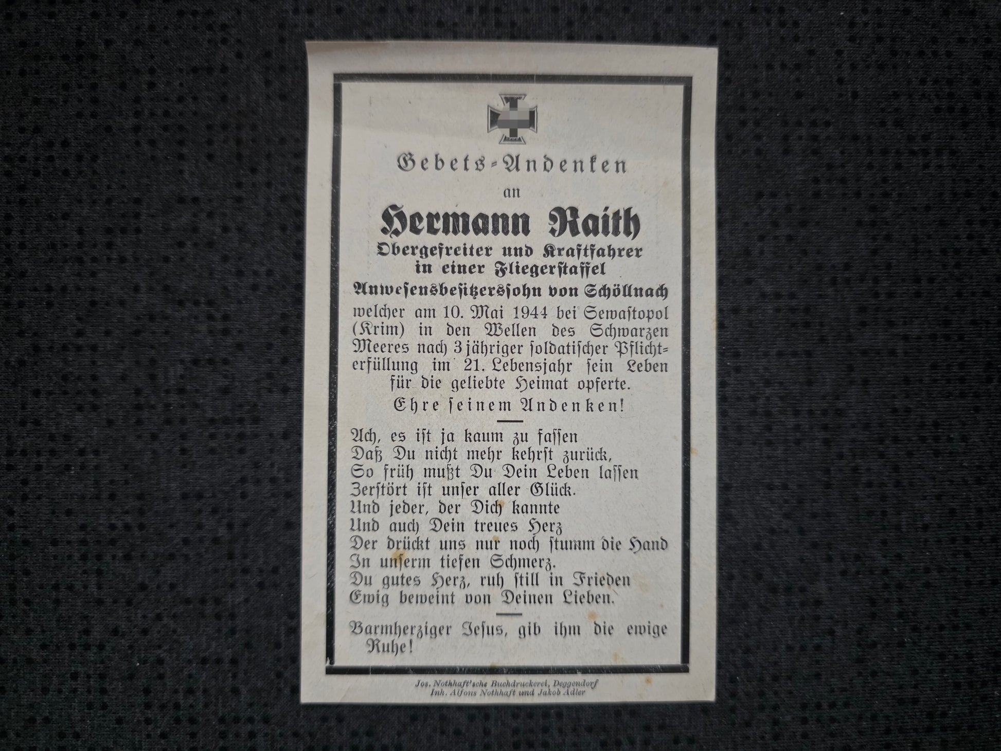 Sterbebild Obergefreiter Schöllnach Fliegerstaffel Schwarzmeerküste Tarabya Türkei