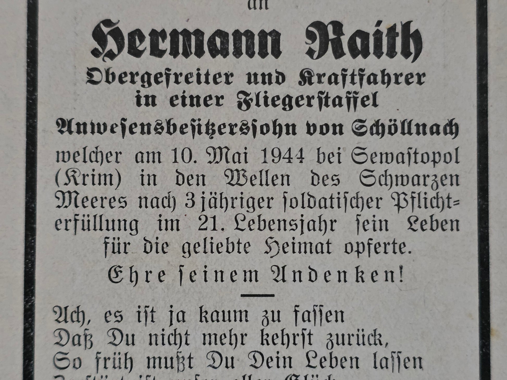 Gefallen am 10.05.1944 im Schwarzen Meer / Krim
