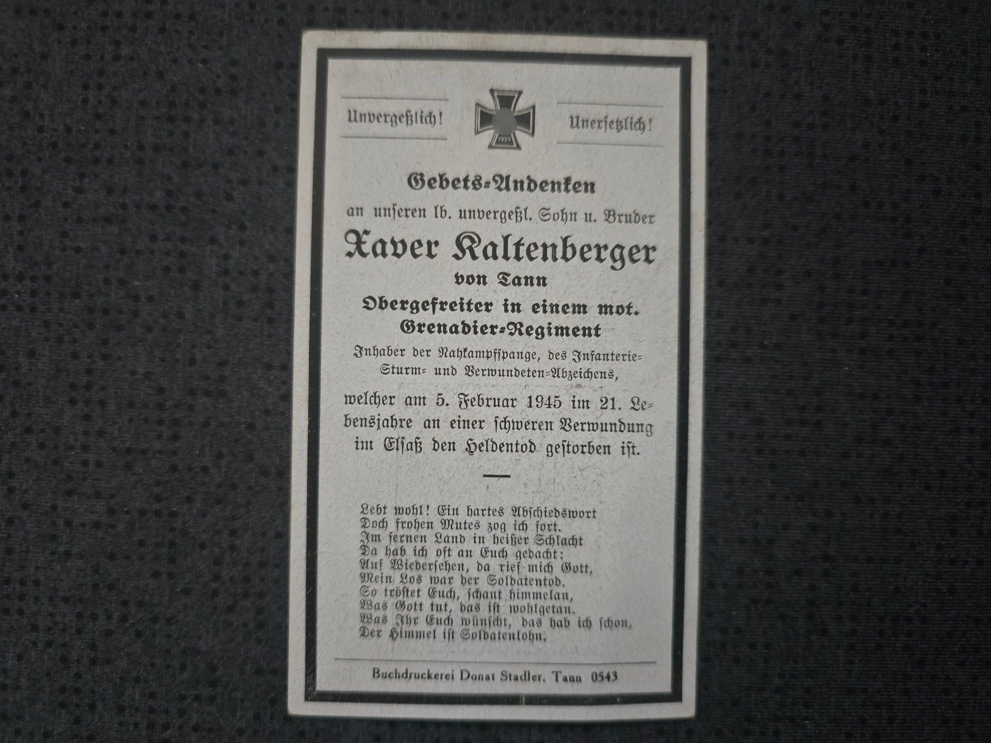 Sterbebild Obergefreiter Tann Gren. Regt. (Mot) NKS Endkampf Elsaß Frankreich