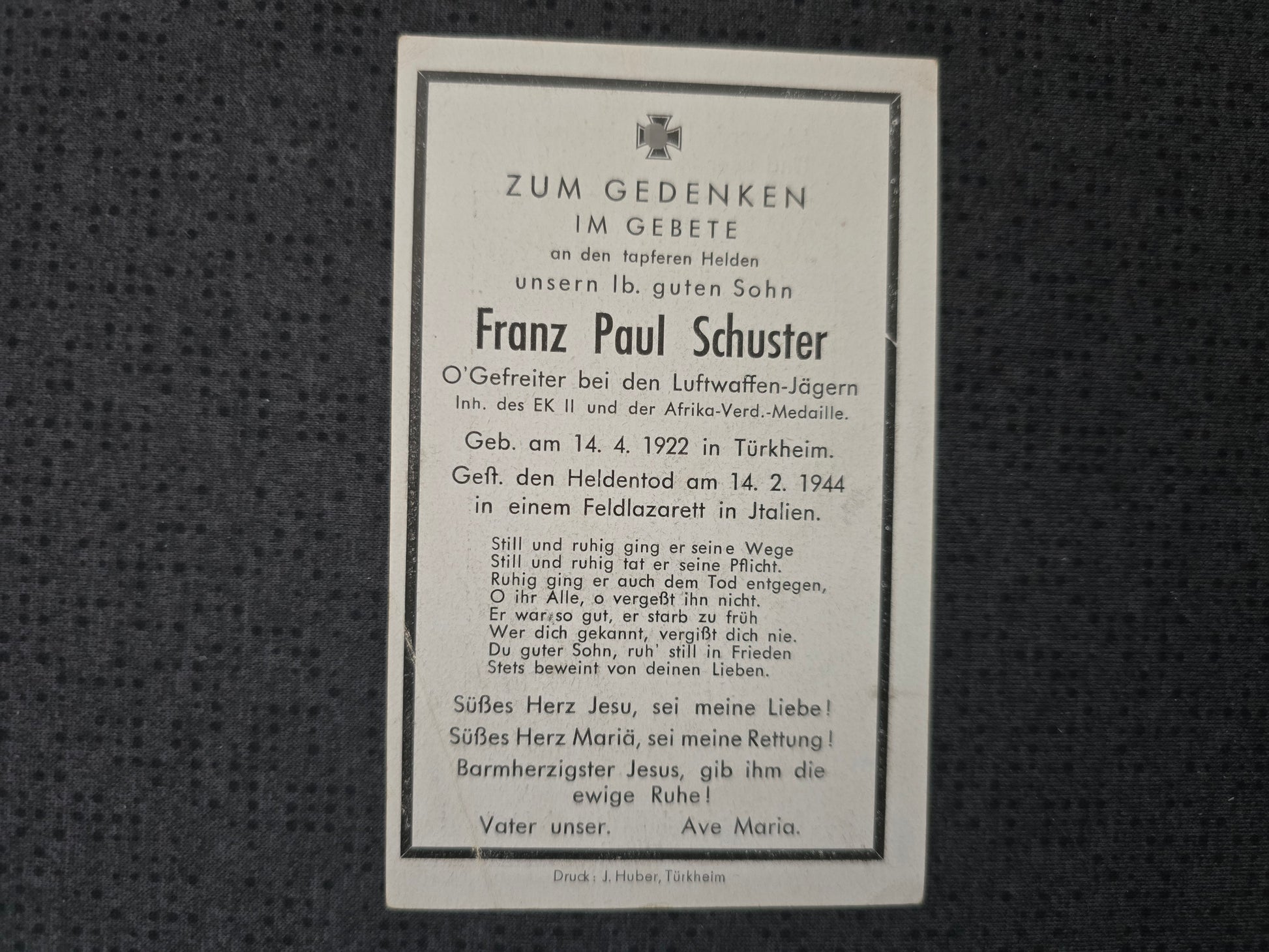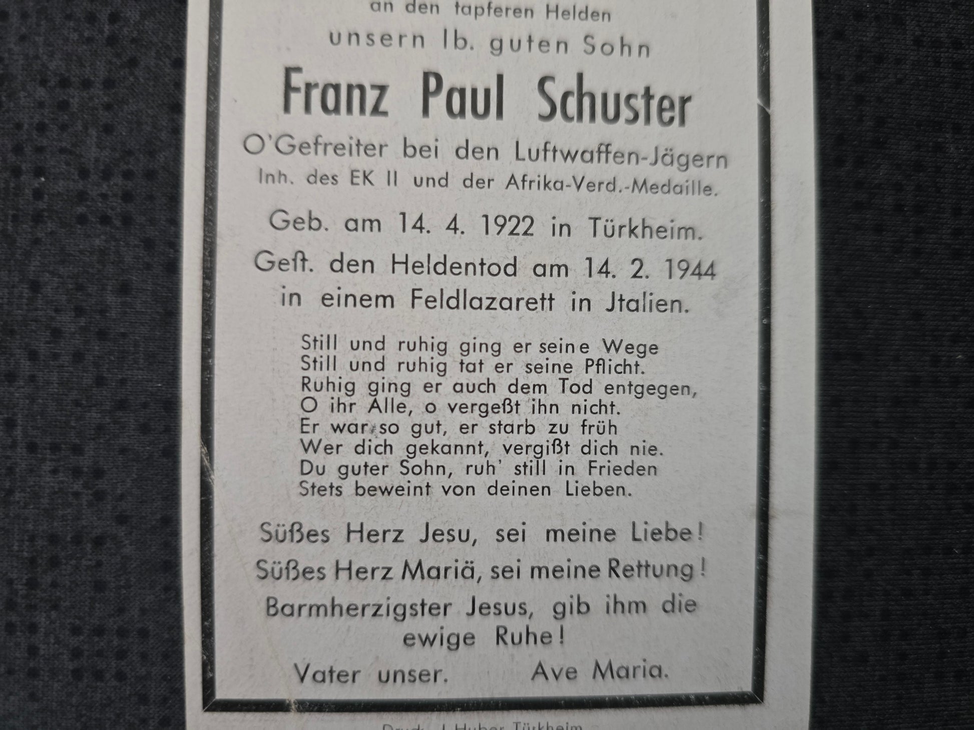 Sterbebild Obergefreiter Türkheim LW-Jäger EK II Afrika-Verdienstmedaille Italien