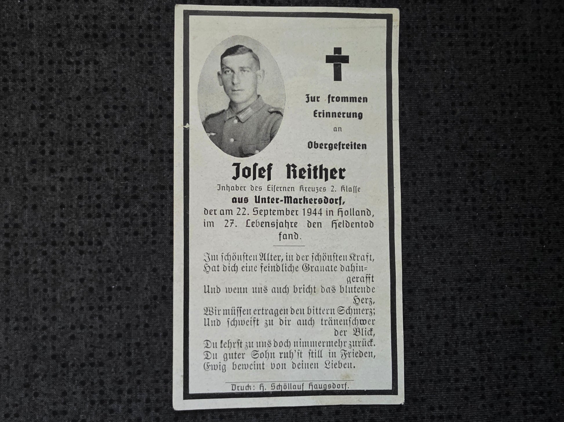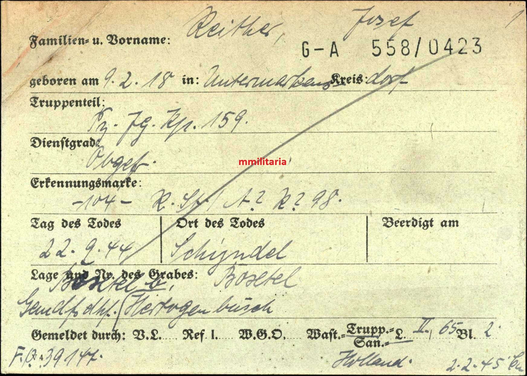 Sterbebild Obergefreiter Untermarkensdorf Panzer-Jäger Komp. 159 Schijndel Ysselsteyn Holland
