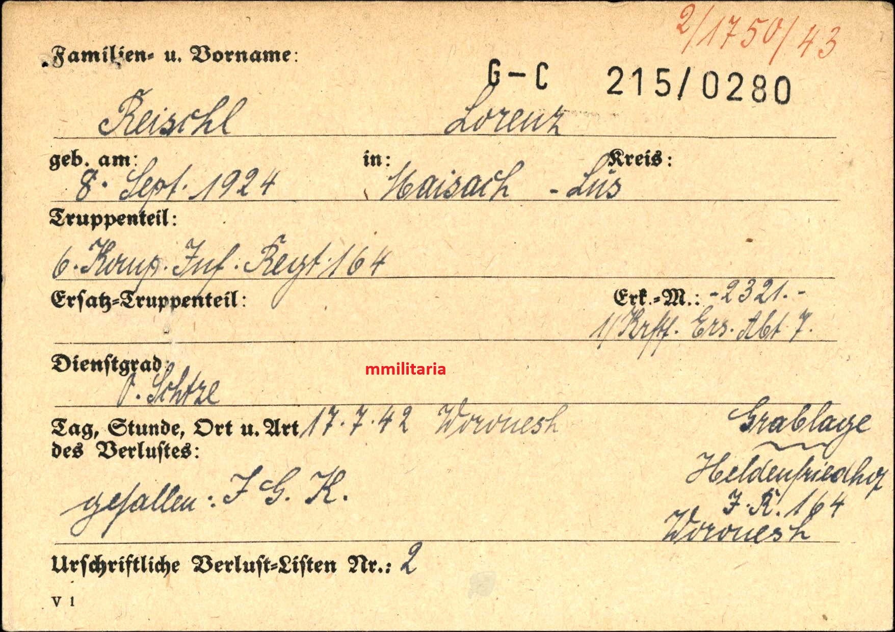 Sterbebild Oberschütze Maisach 6. Komp. Inf. Regt. 164 Woronesh Russland