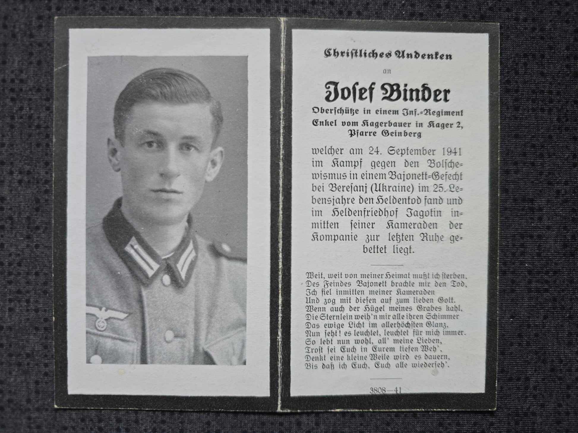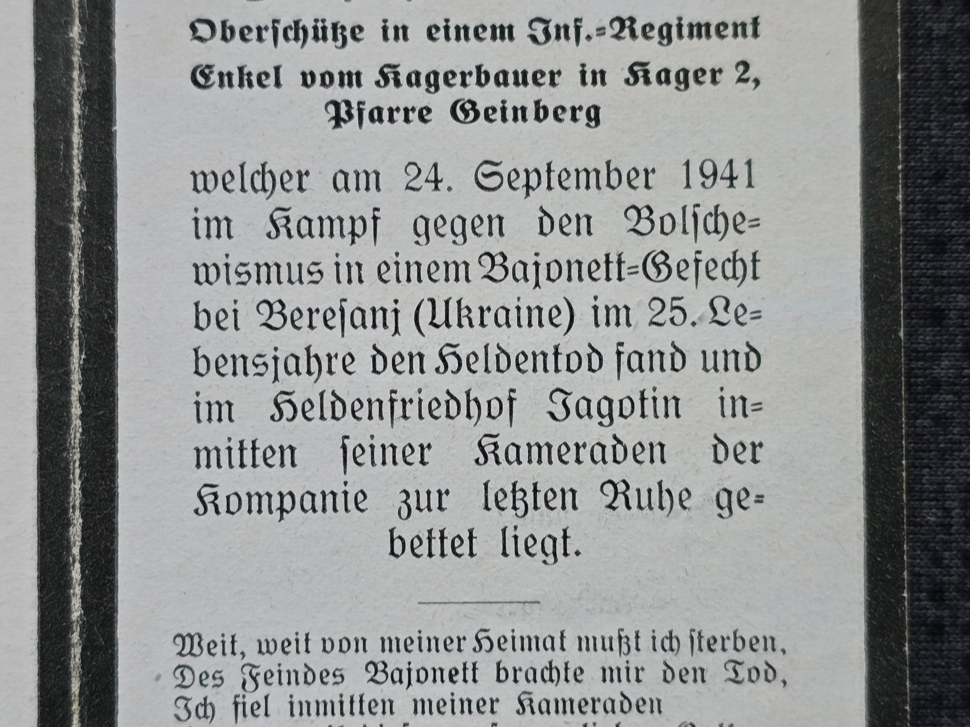 Sterbebild Oberschütze Geinberg 11. Komp. Inf. Regt. 133 Bajonett Gefecht Nahkampf Beresan Ukraine