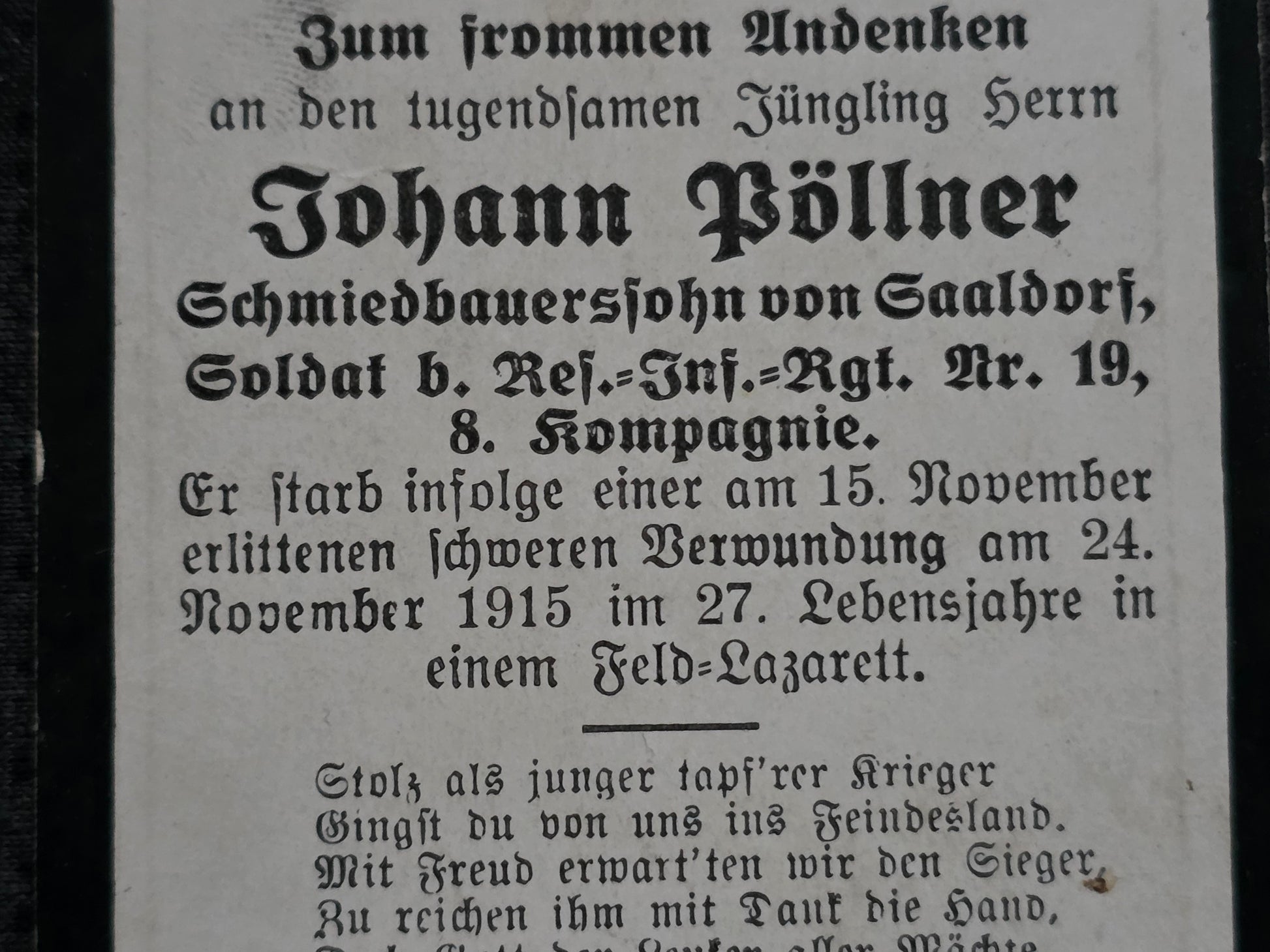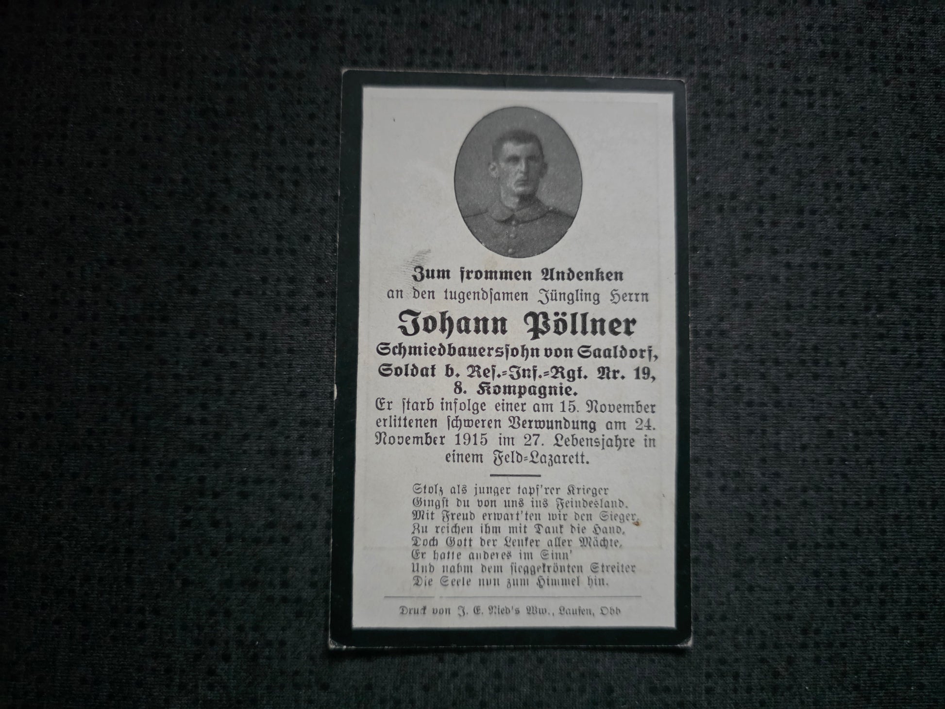 Sterbebild Soldat Saaldorf 8. Komp. Inf. Regt. 19 Elsaß Breitenbach Frankreich