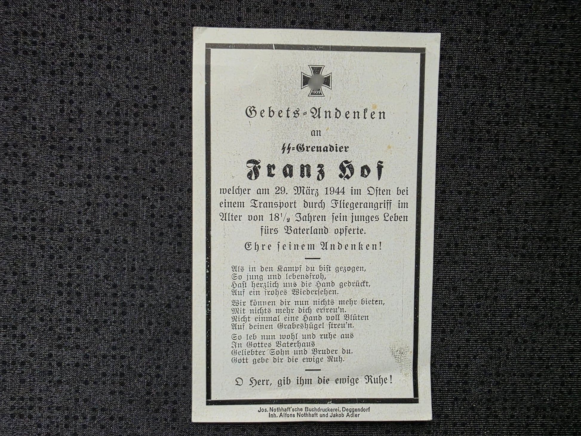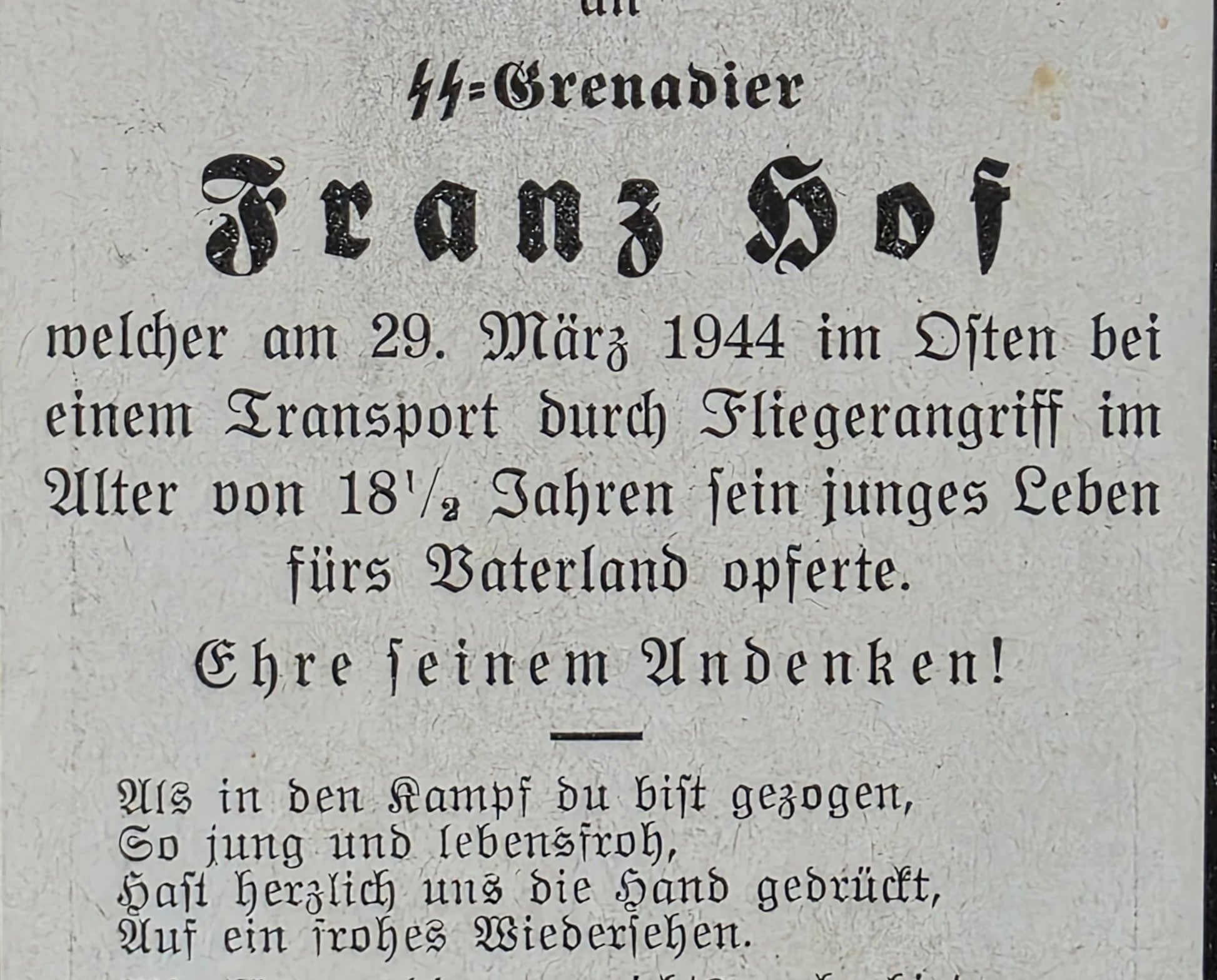 ***Möglicherweise stimmt der Text auf der Karte nicht, da ein F. Hof als SS-Grenadier laut Volksbund am 29.03.1944 in Vaires / Normandie (Frankreich) gefallen ist.