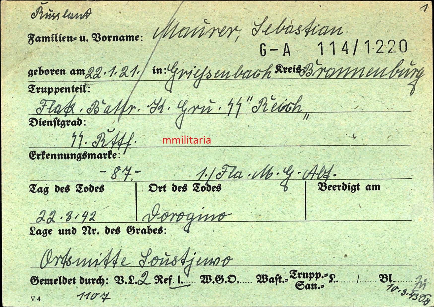 Sterbebild SS-Rottenführer Flak Batterie Division "Das Reich" Objenino Russland