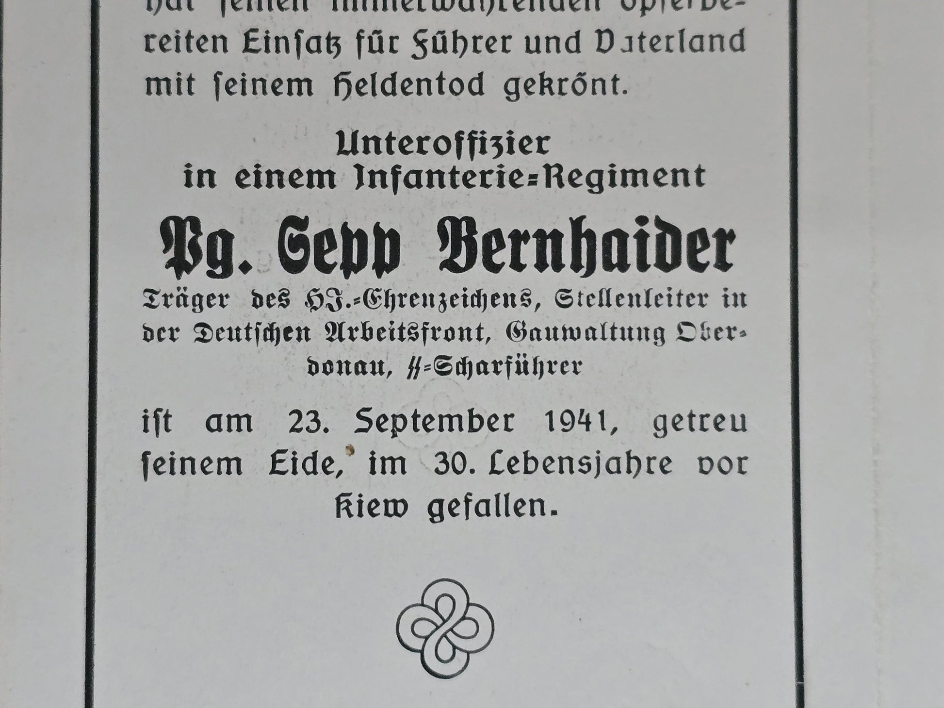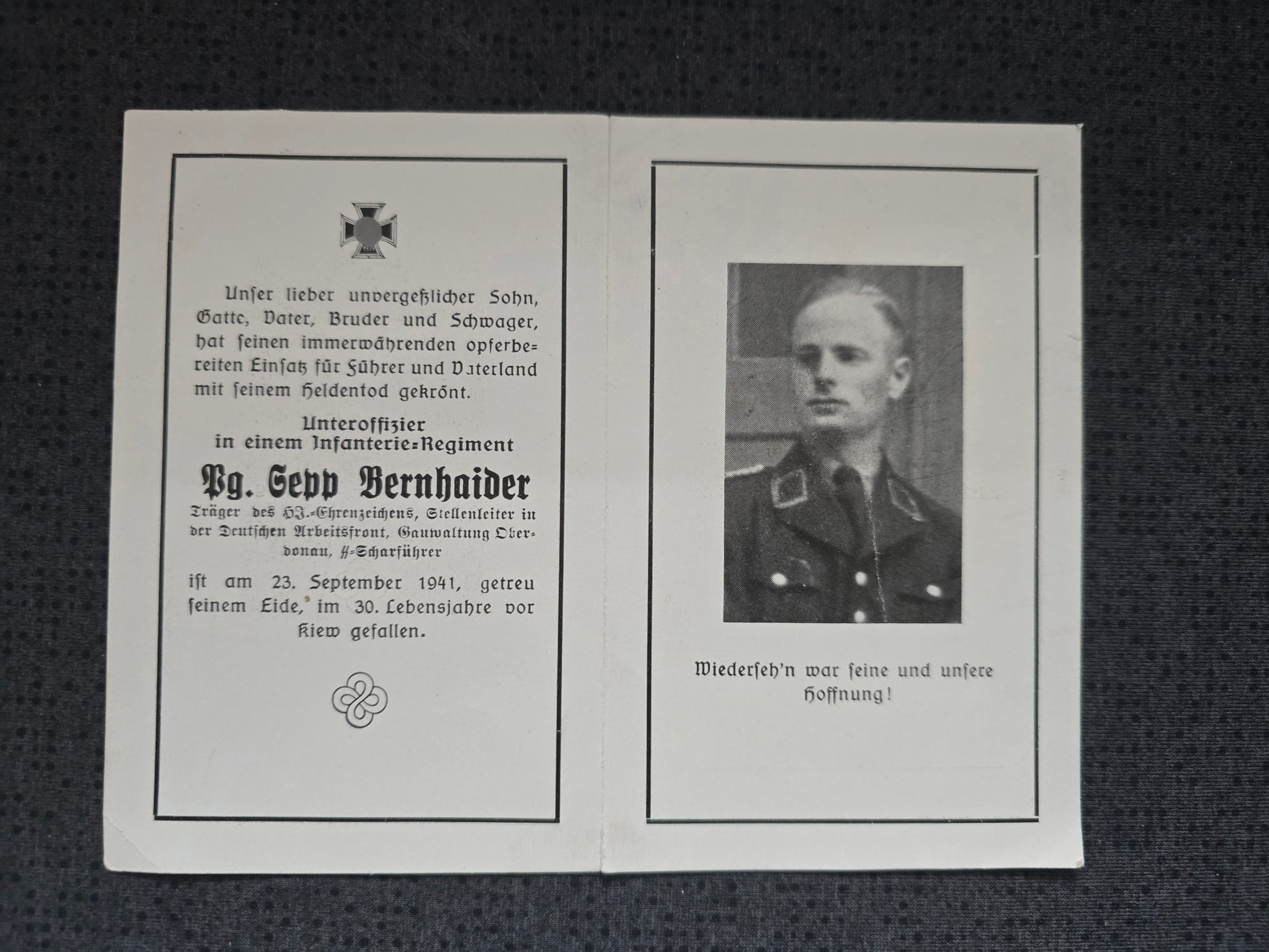 Sterbebild SS-Scharführer Schwarzenberg 3. Komp. Inf. Regt. 130 HJ-Ehrenzeichen Perejaslawskaja Ukraine