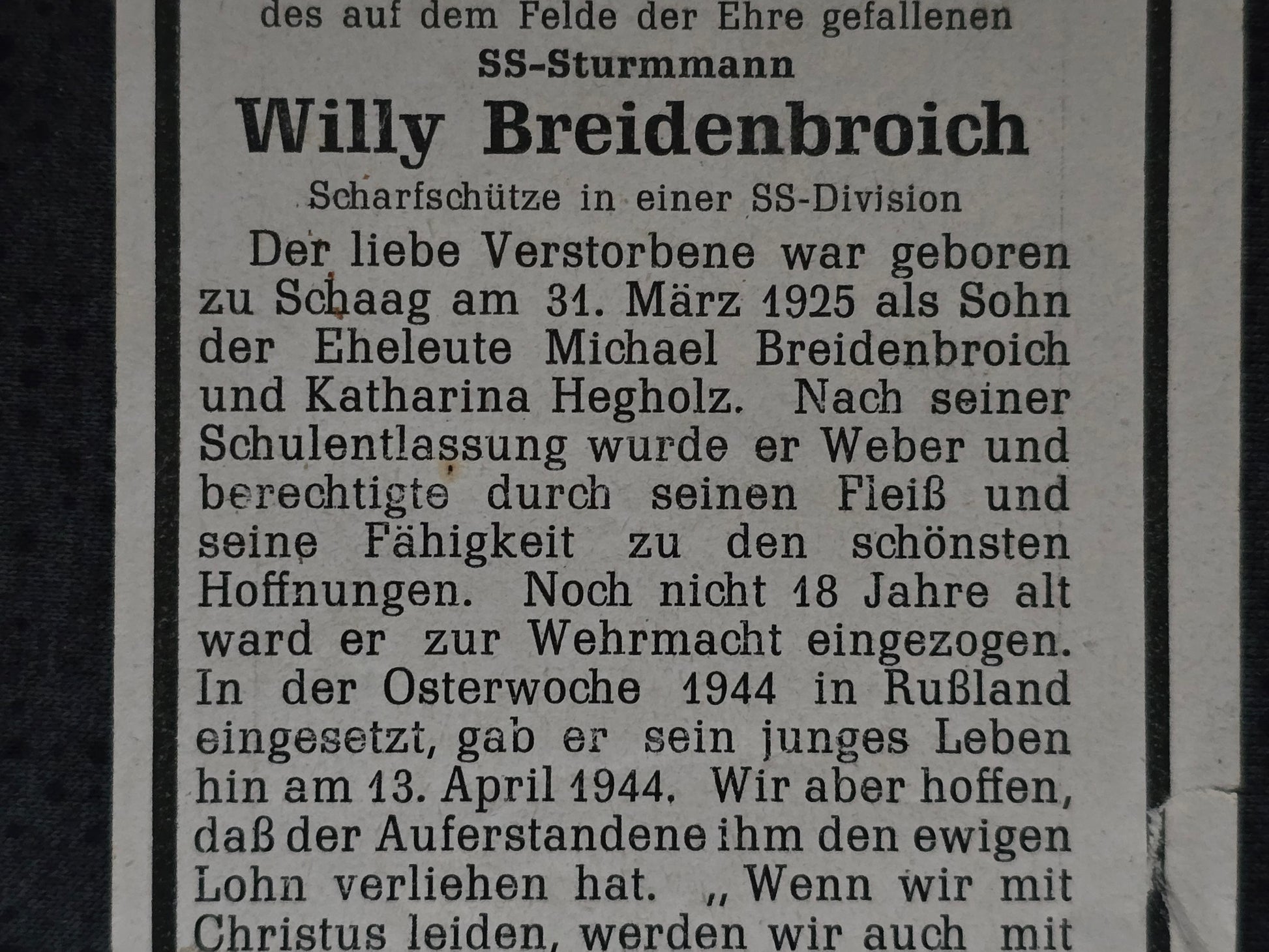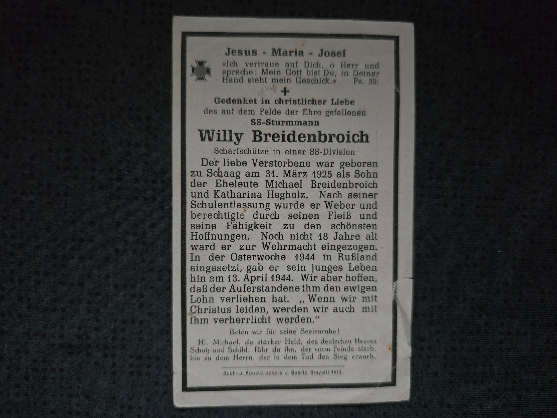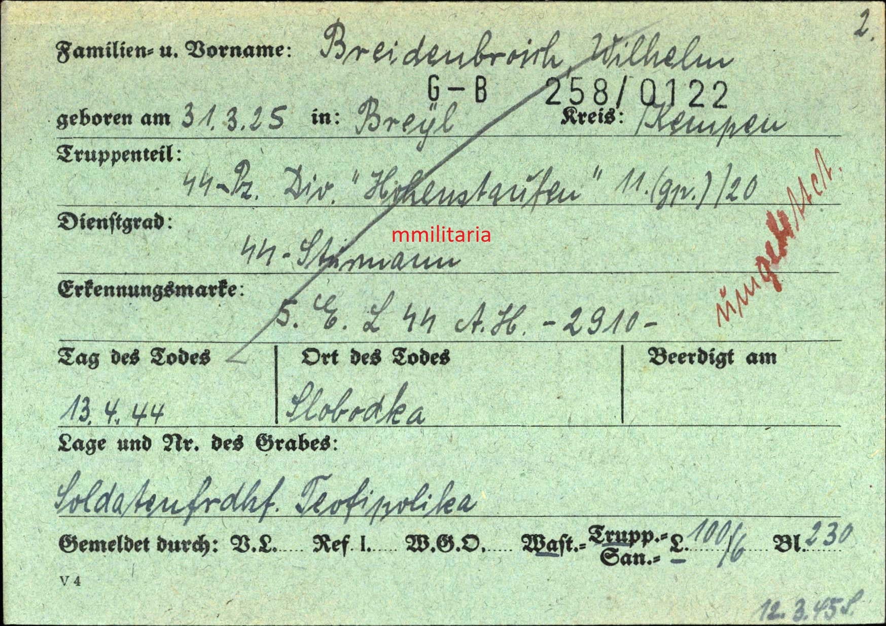 Sterbebild SS-Sturmmann Breyell SS-Panzerdivision "Hohenstaufen" Scharfschütze 18 Jahre Slobodka Ukraine