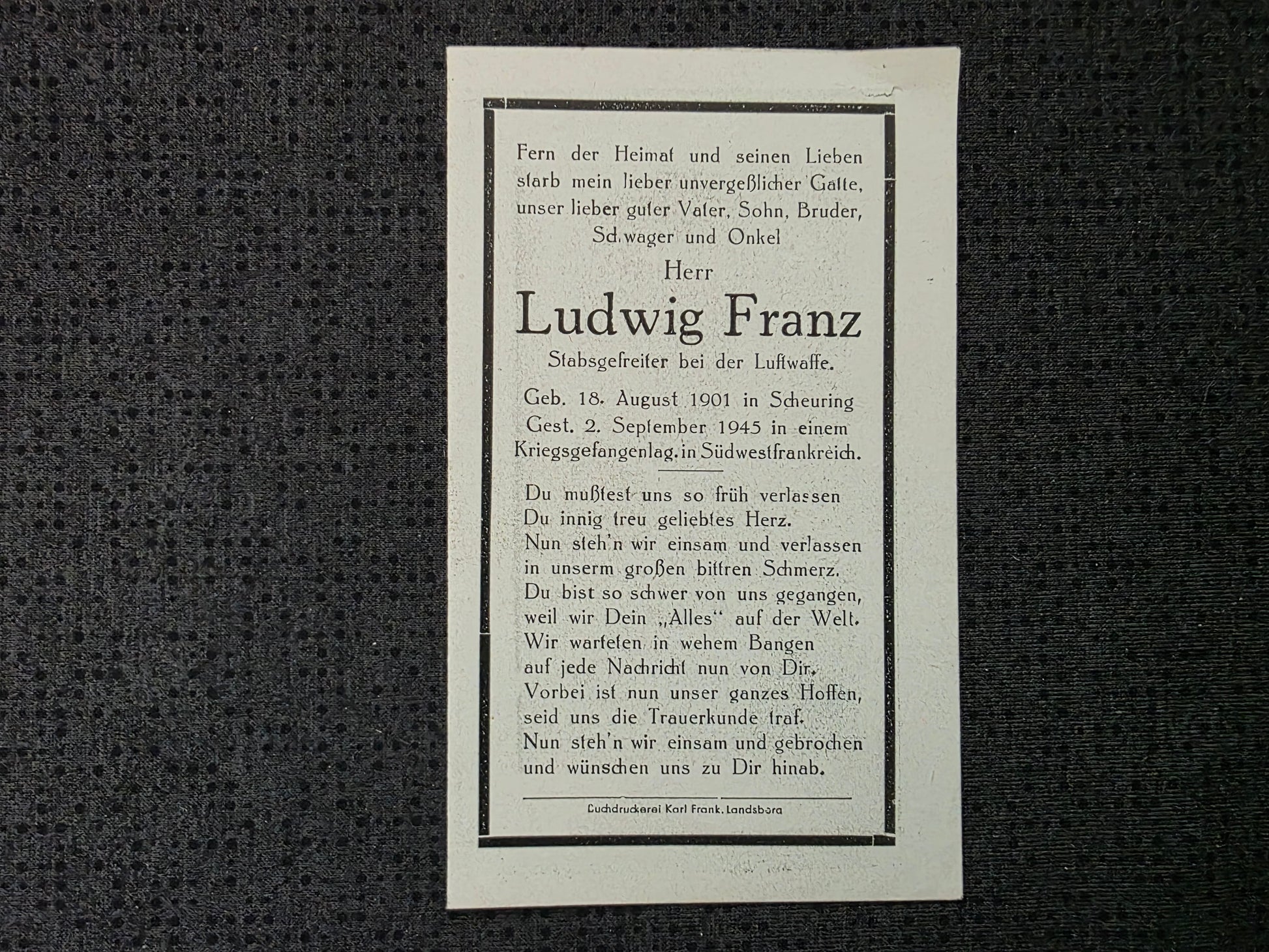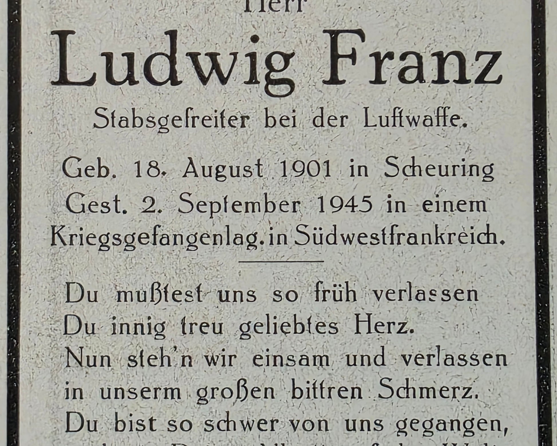 Sterbebild Stabsgefreiter Scheuring Luftwaffe KGL Cozes Berneuil Frankreich