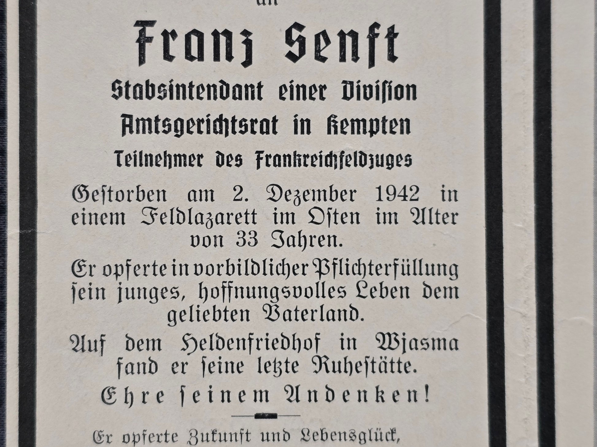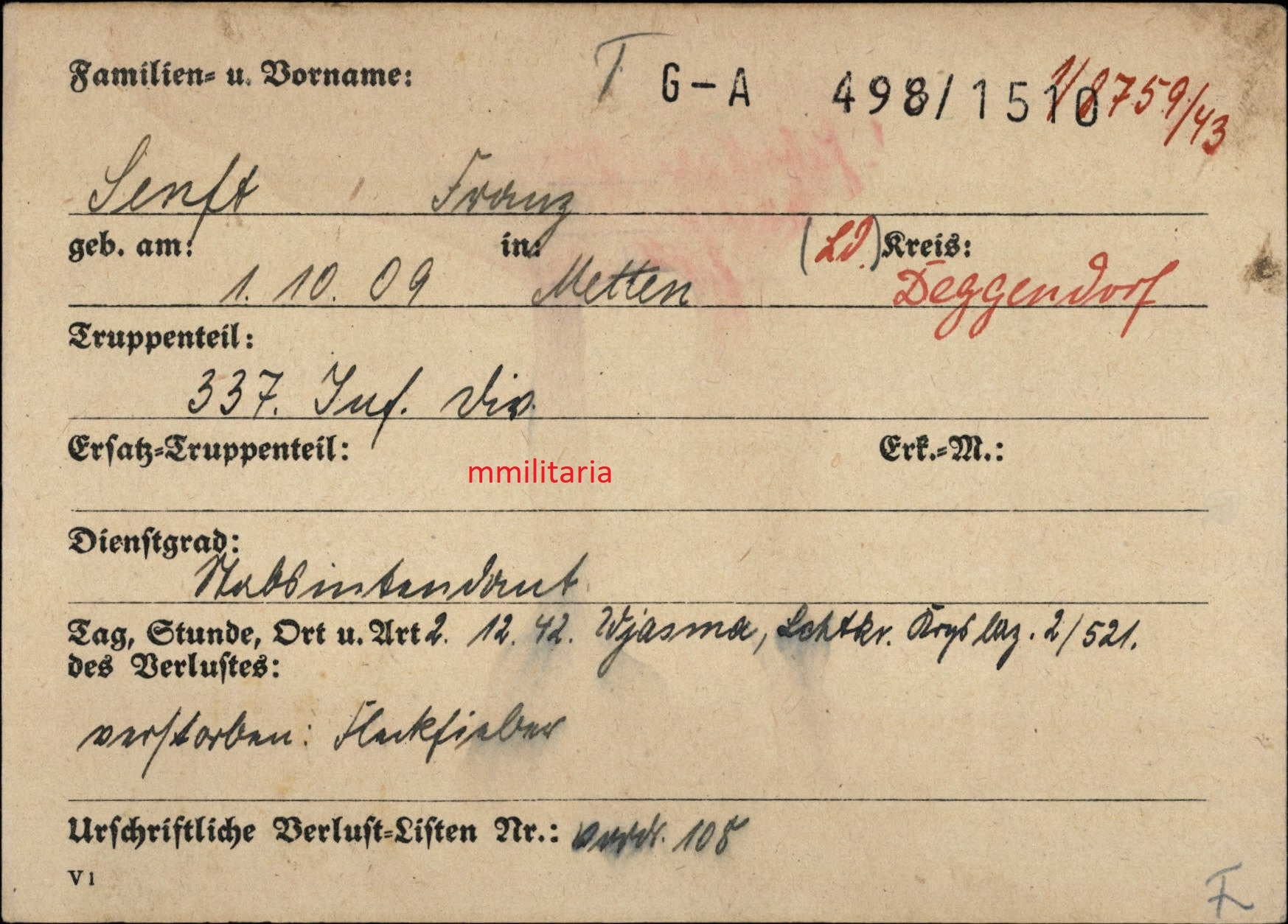 Sterbebild Stabsintendant Metten 337. Inf. Division Wjasma Duchowschtschina Russland