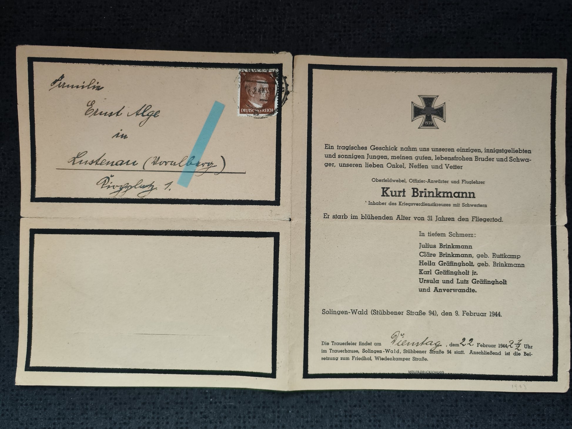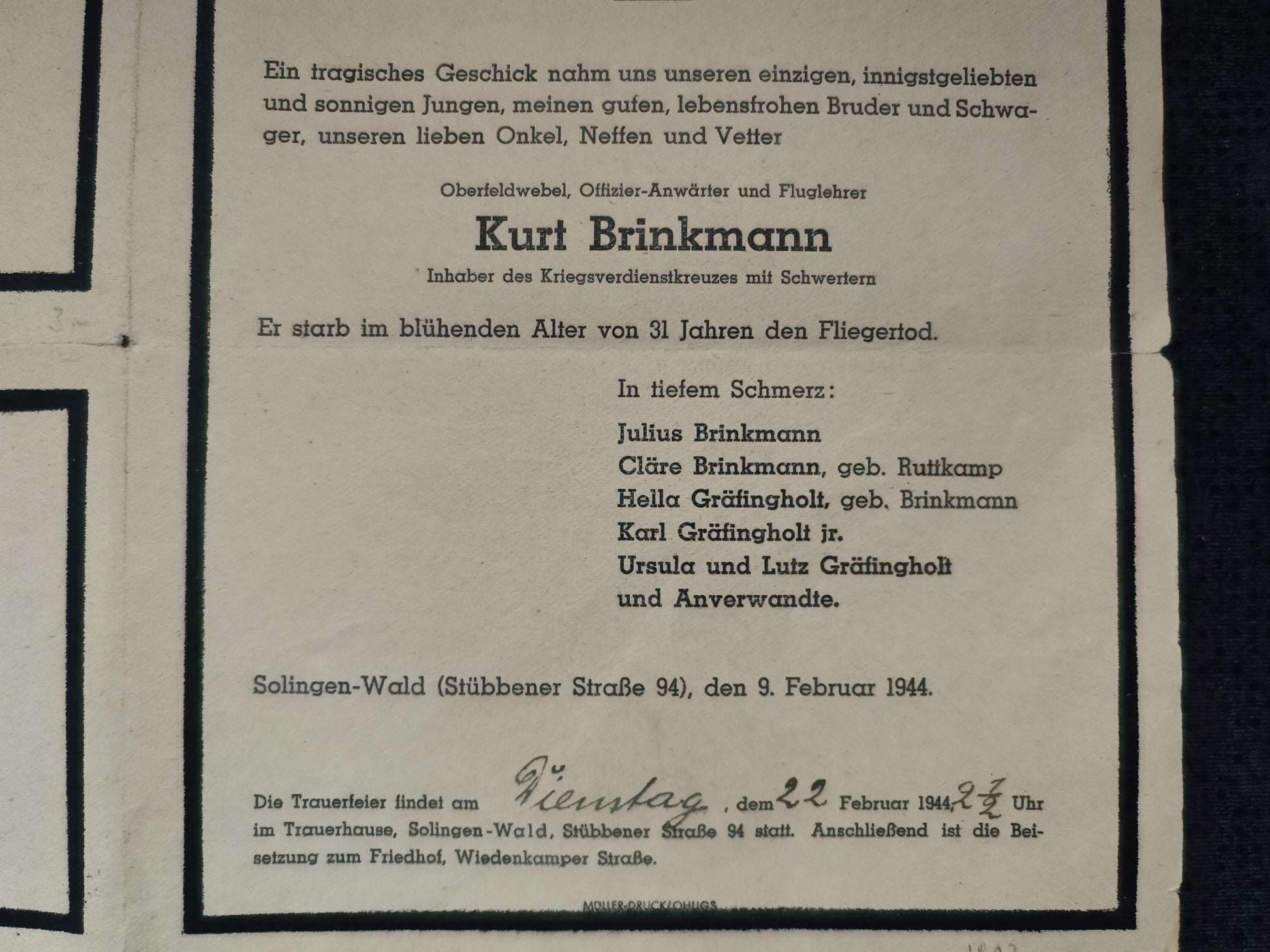 Sterbebild Trauerbrief Oberfeldwebel Solingen OA Anwärter Fluglehrer Schöngarten bei Breslau Polen