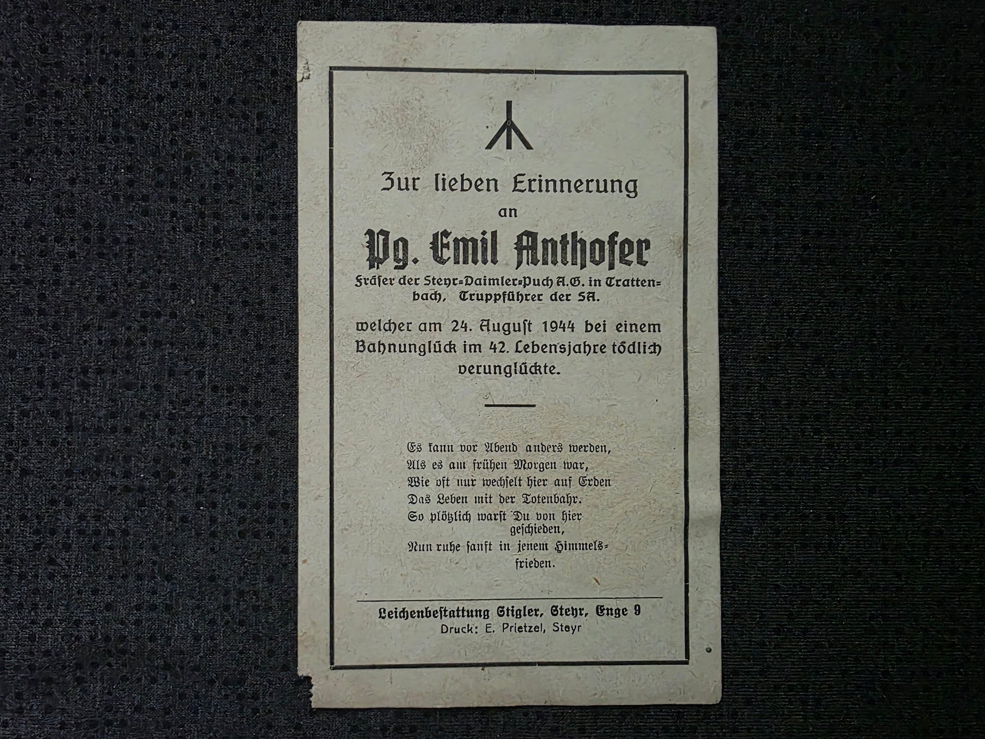 Sterbebild Truppführer der SA Trattenbach Bahnunglück 1944