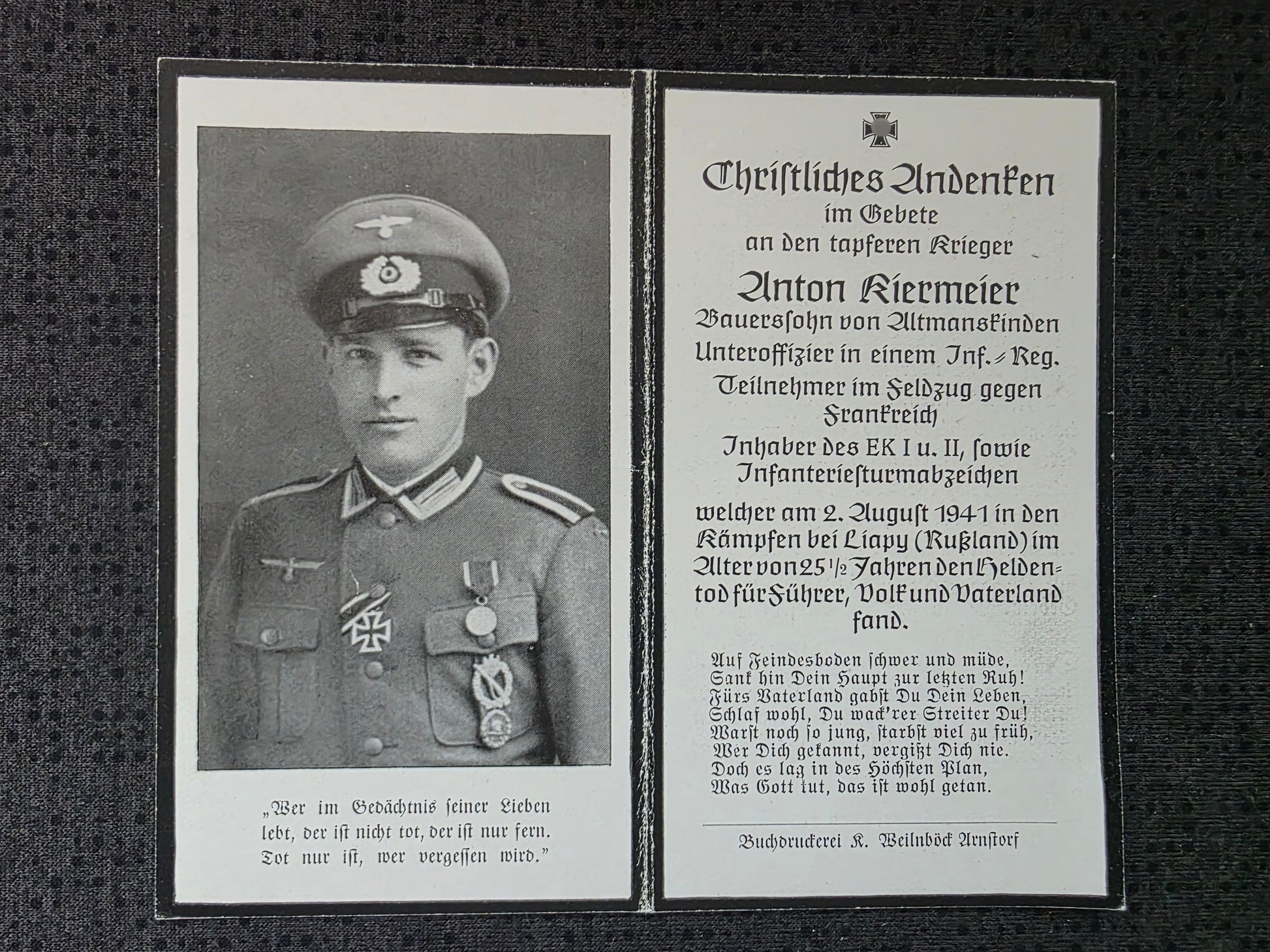 Sterbebild Unteroffizier Altmannslinden 1. Komp. Inf. Regt. 468 Ljapy Russland