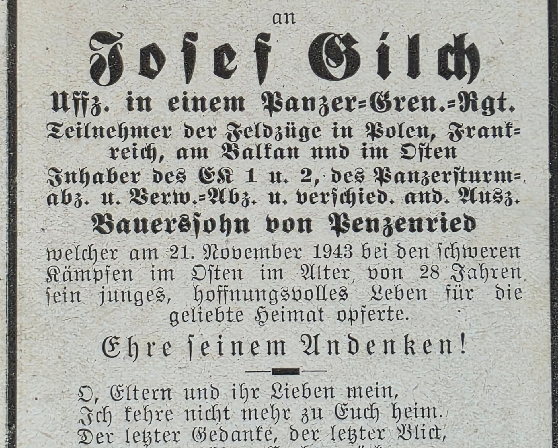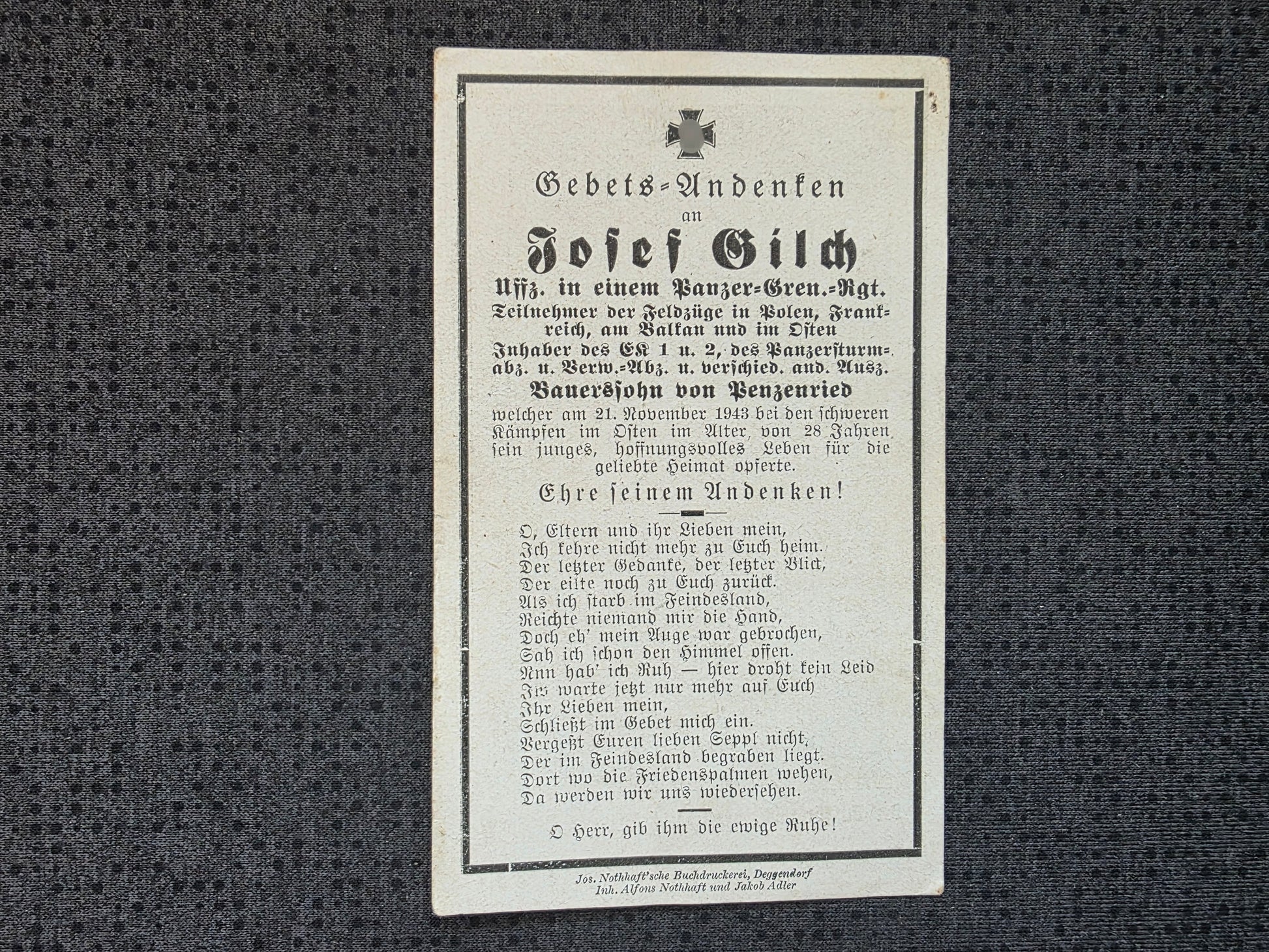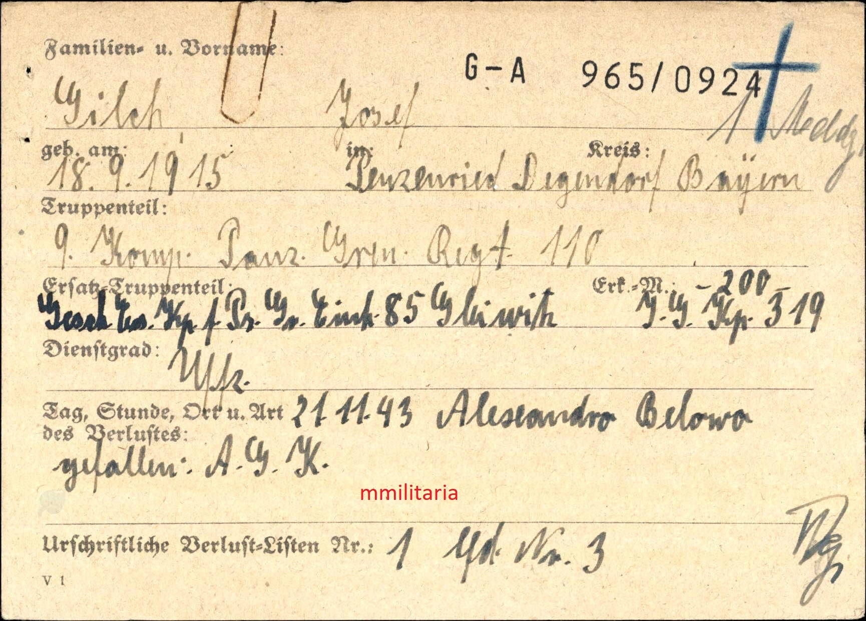 Sterbebild Unteroffizier Deggendorf 9. Komp. Panzer-Gren. Regt. 110 PKA Belowo Russland