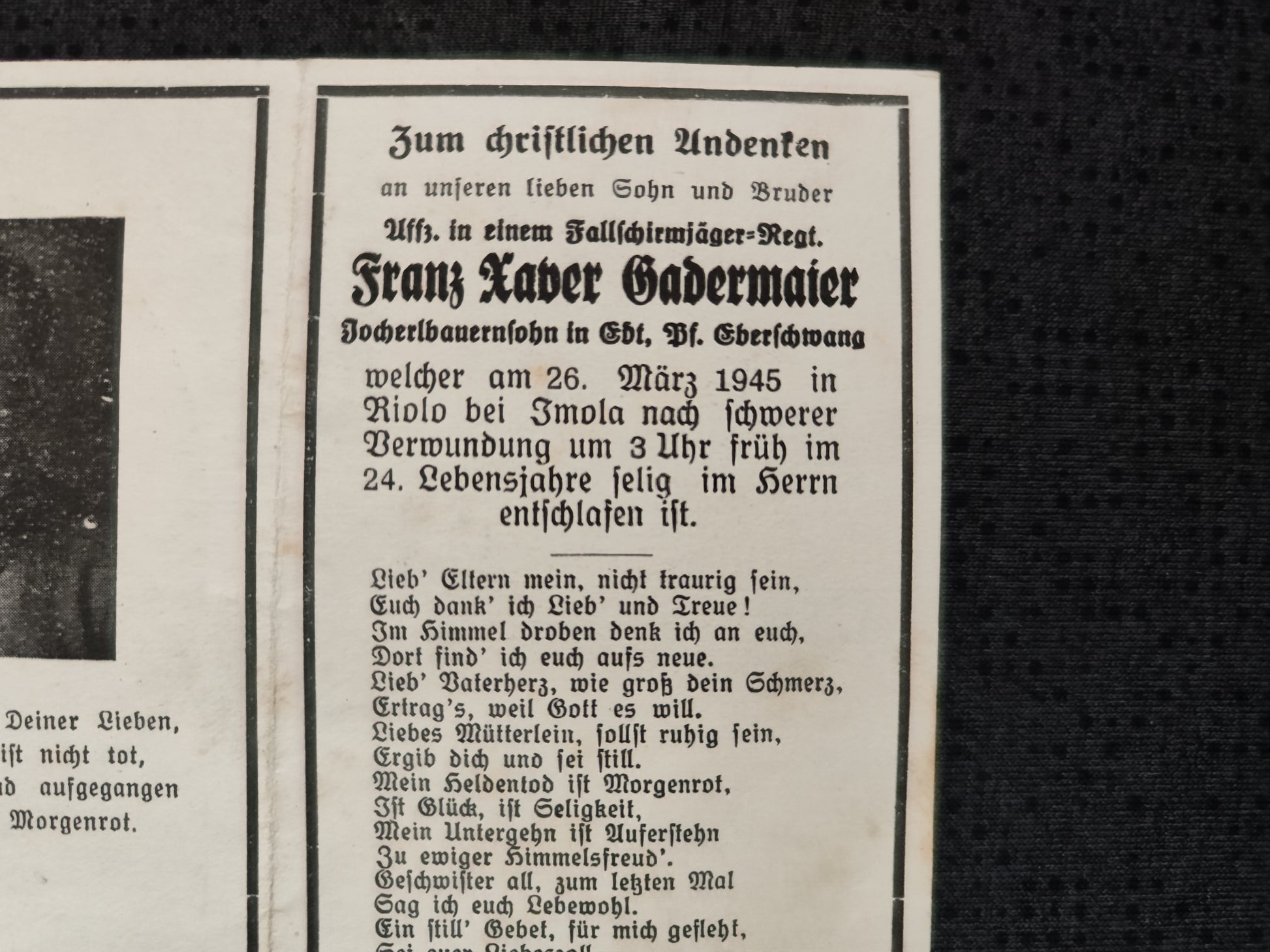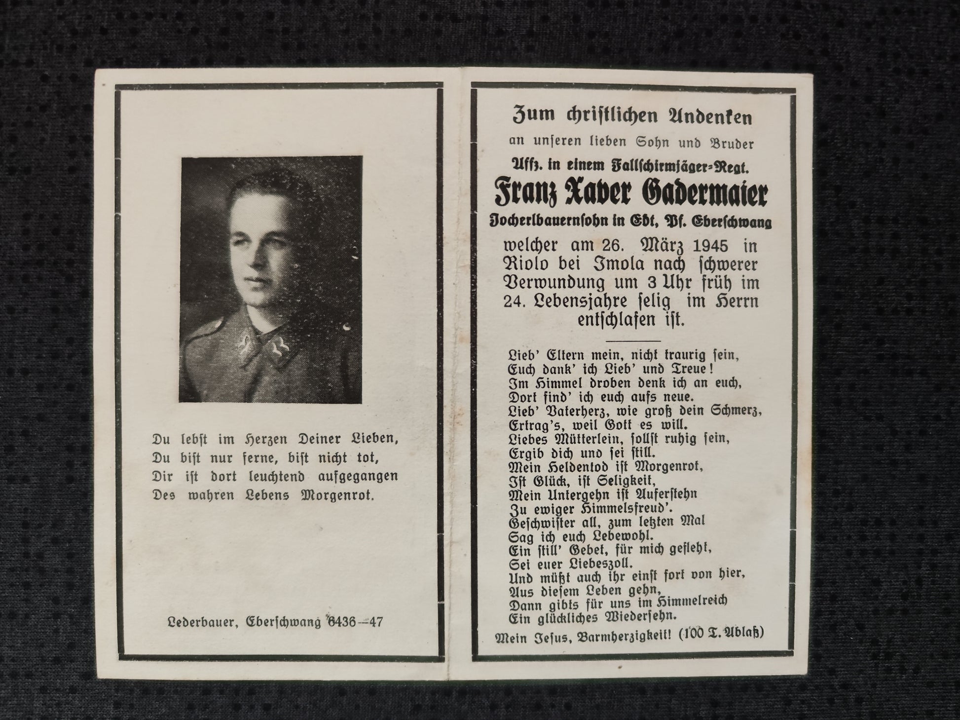 Sterbebild Unteroffizier Eberschwang Fallschirmjäger Regt. Endkampf Passarina Riolo Futa-Pass Italien