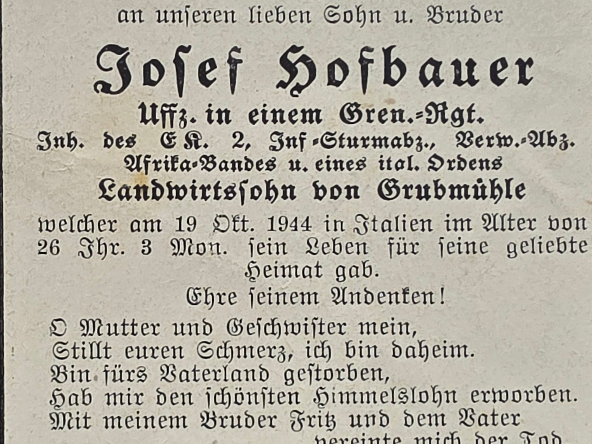 Sterbebild Unteroffizier Grubmühle Grenadier Regt. Italienischer Orden Afrika-Spange Italien