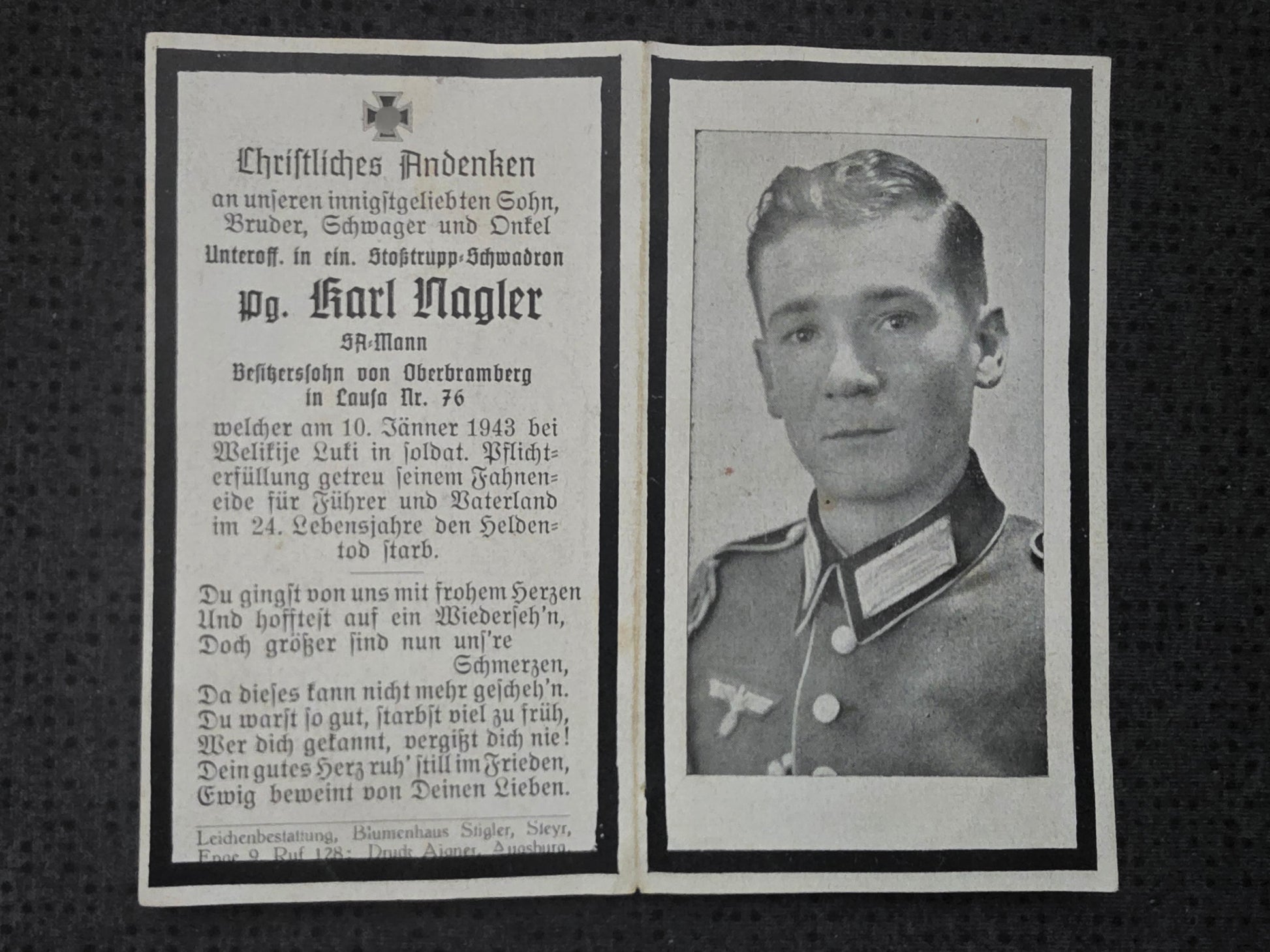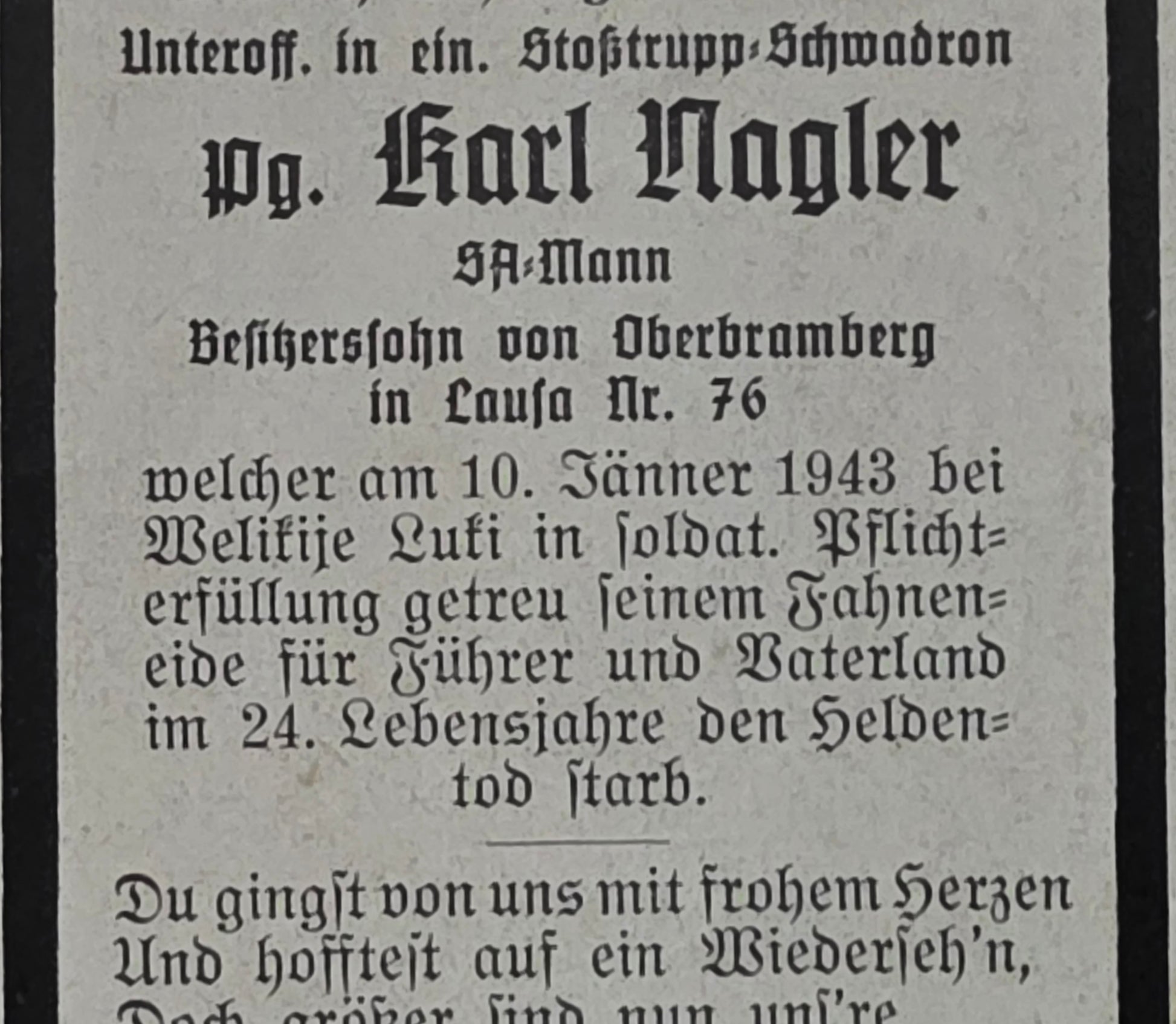 Sterbebild Unteroffizier Lausa 2. Radfahr-Abt. 331 SA-Mann Podberesje Demjansk Russland