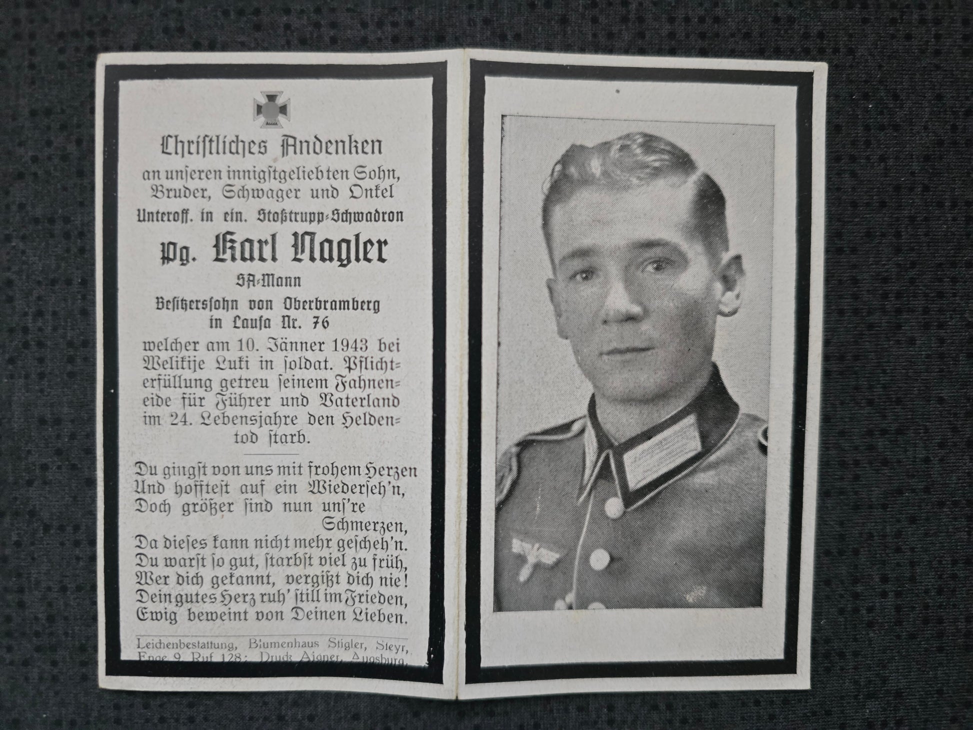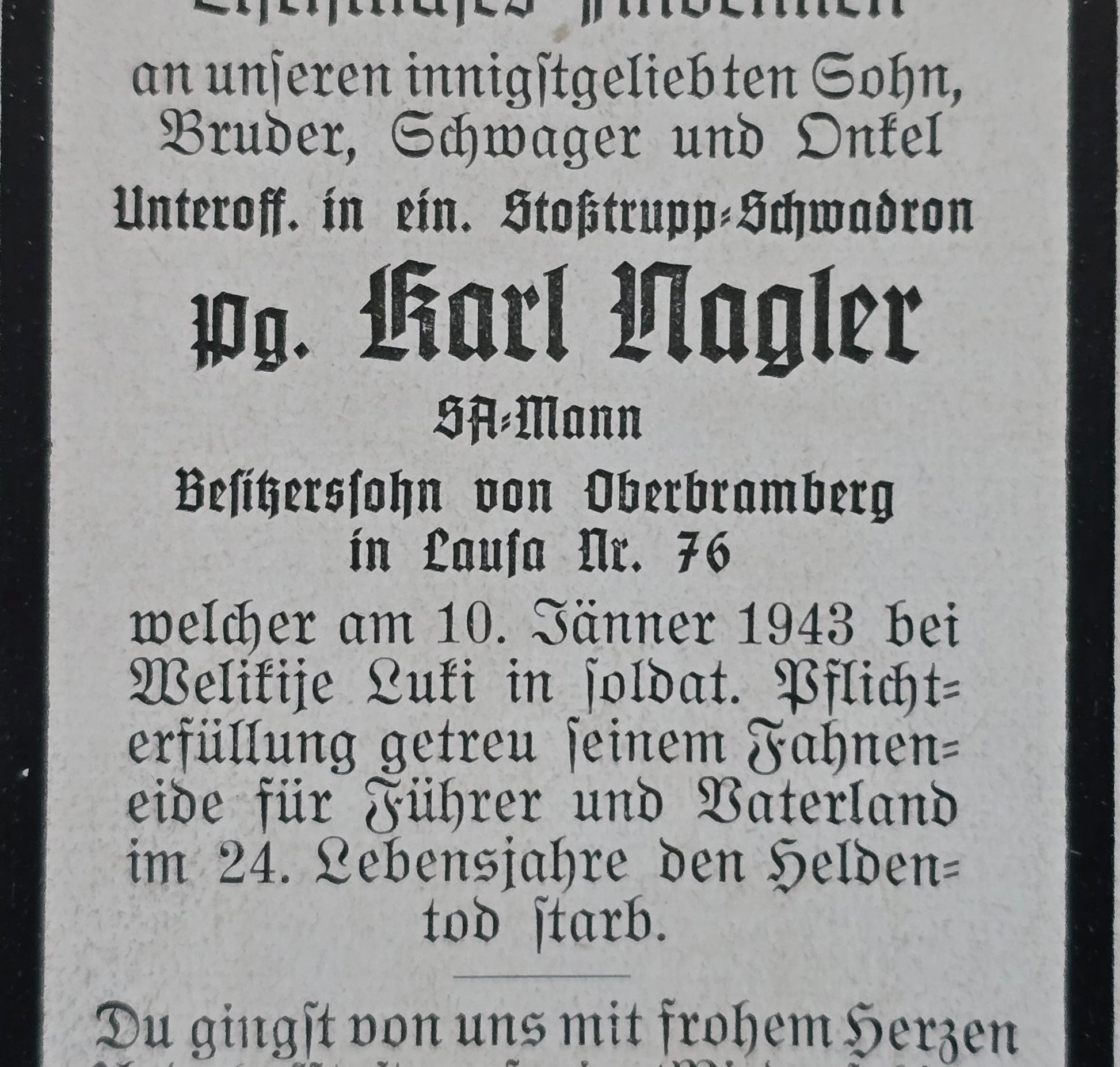 Sterbebild Unteroffizier Lausa 2. Radfahr Abt. 331 Stoßtrupp SA-Mann Podberesje Russland