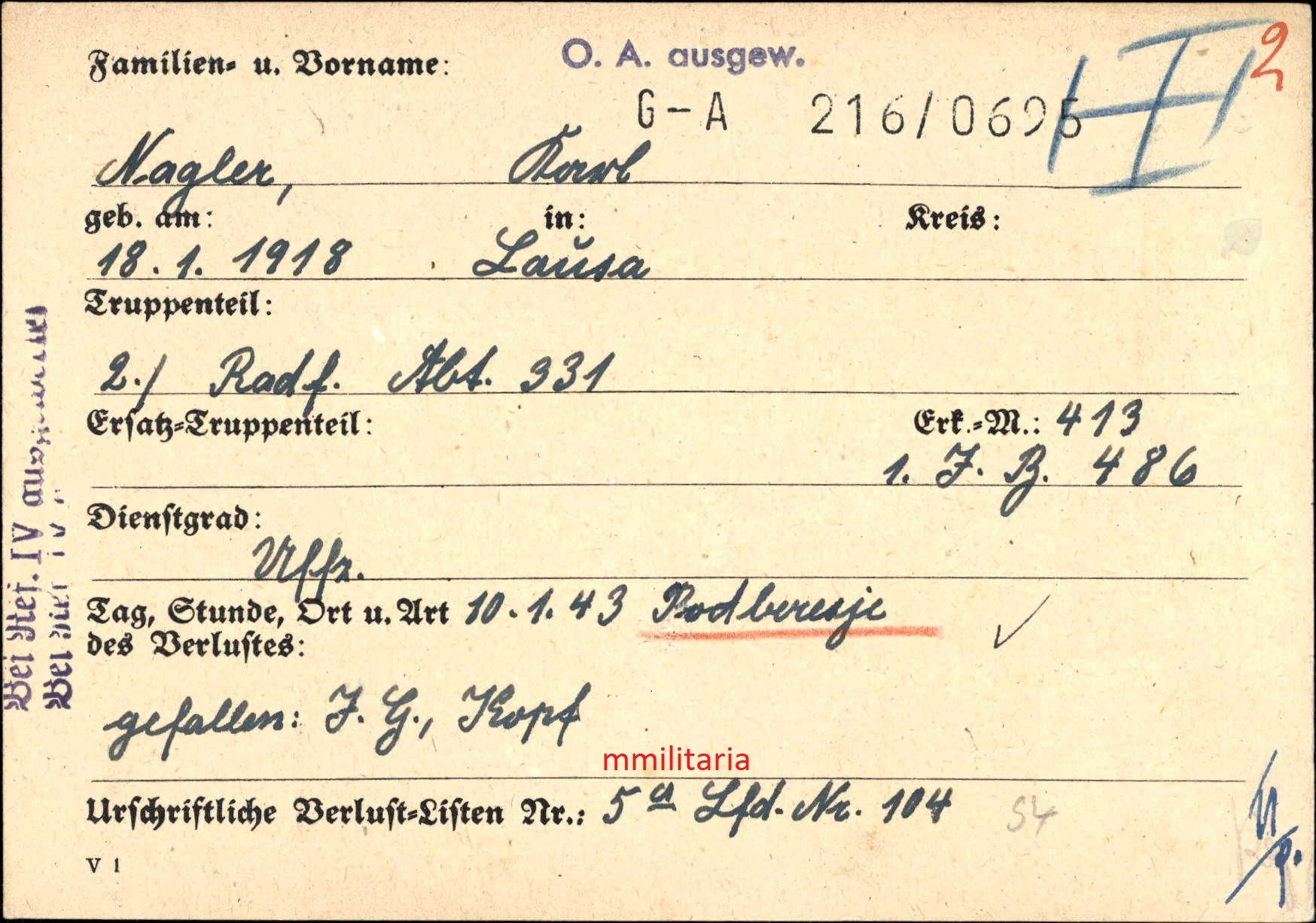 Gefallen am 10.01.1943 bei Podberesje (Russland)